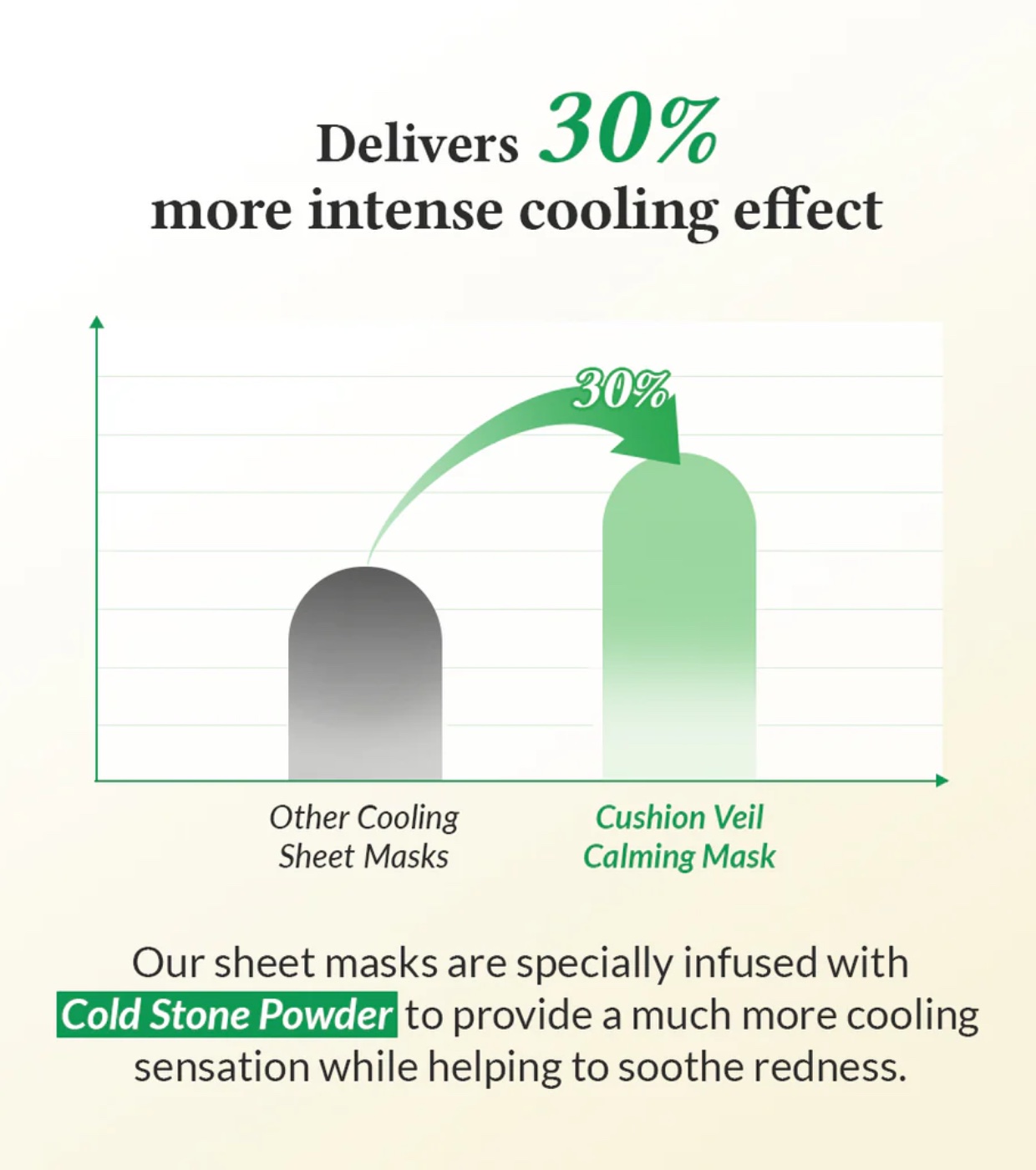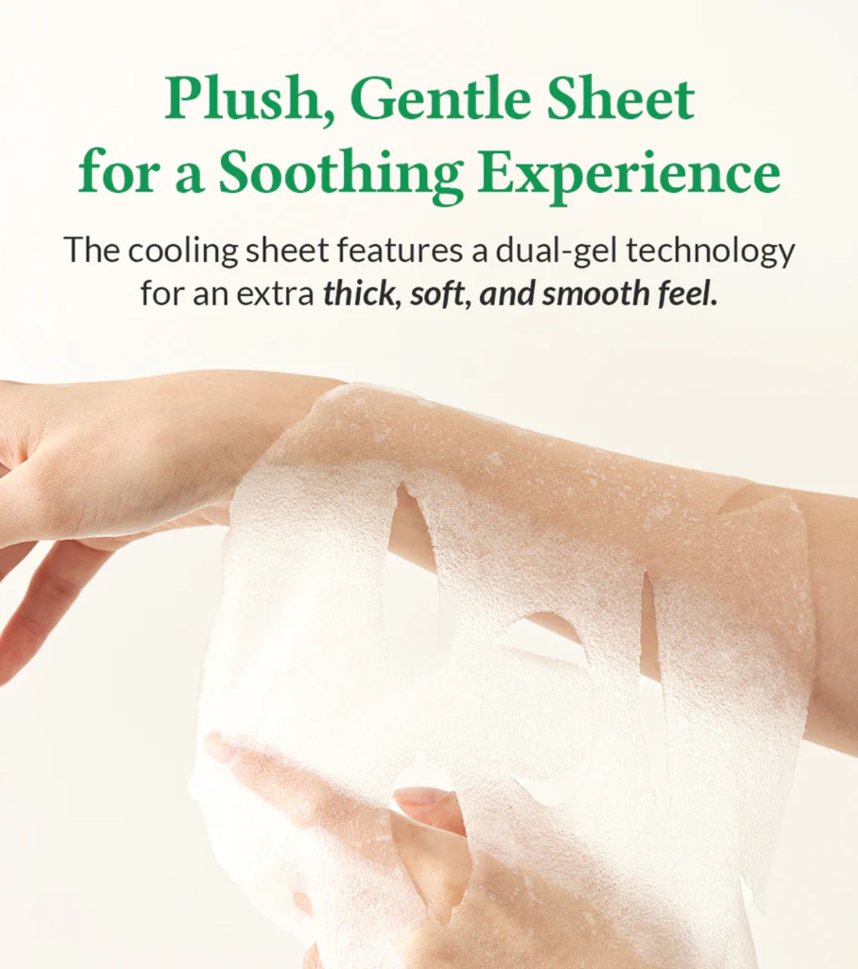La mascarilla está impregnada con polvo de piedra fría y fabricada con tecnología de doble gel, lo que proporciona un efecto refrescante inmediato que ayuda a reducir el enrojecimiento y la sensibilidad de la piel.