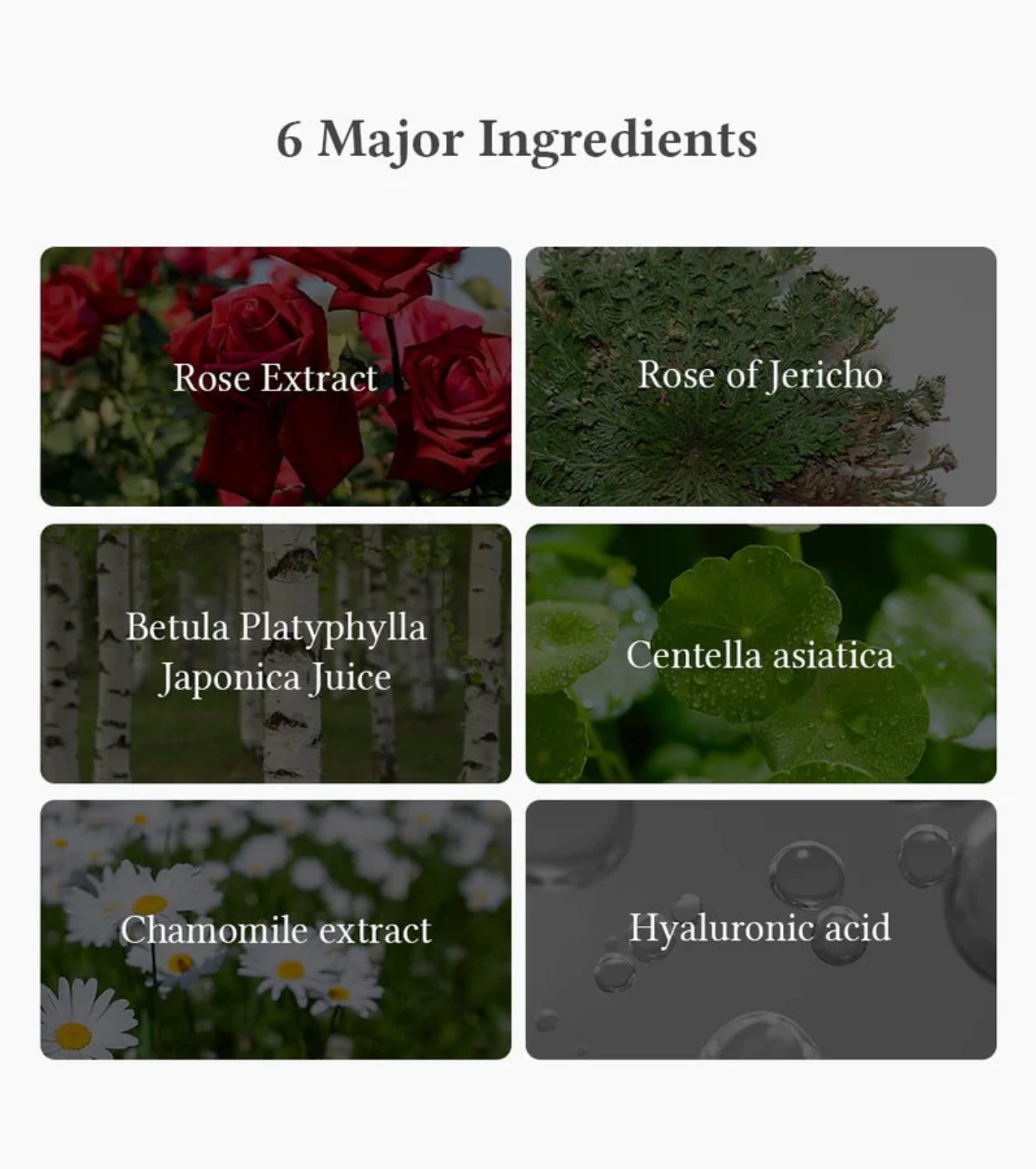 Contiene Extracto de Anastatica Hierochuntica (también conocida como Verdadera Rosa de Jericó) y una combinación de 6 ingredientes principales para el cuidado de la piel.