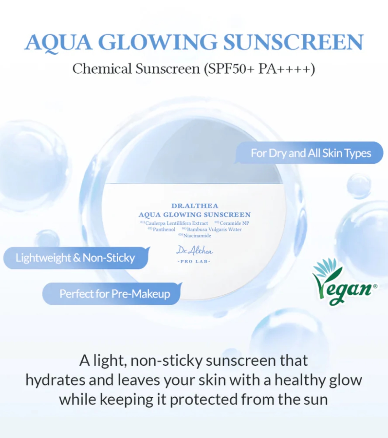 El Aqua Glowing Sunscreen SPF50+ PA++++ de Dr. Althea es un protector solar coreano ultraligero que ofrece alta protección de amplio espectro contra rayos UVA y UVB, mientras hidrata y aporta un acabado luminoso y natural a la piel.