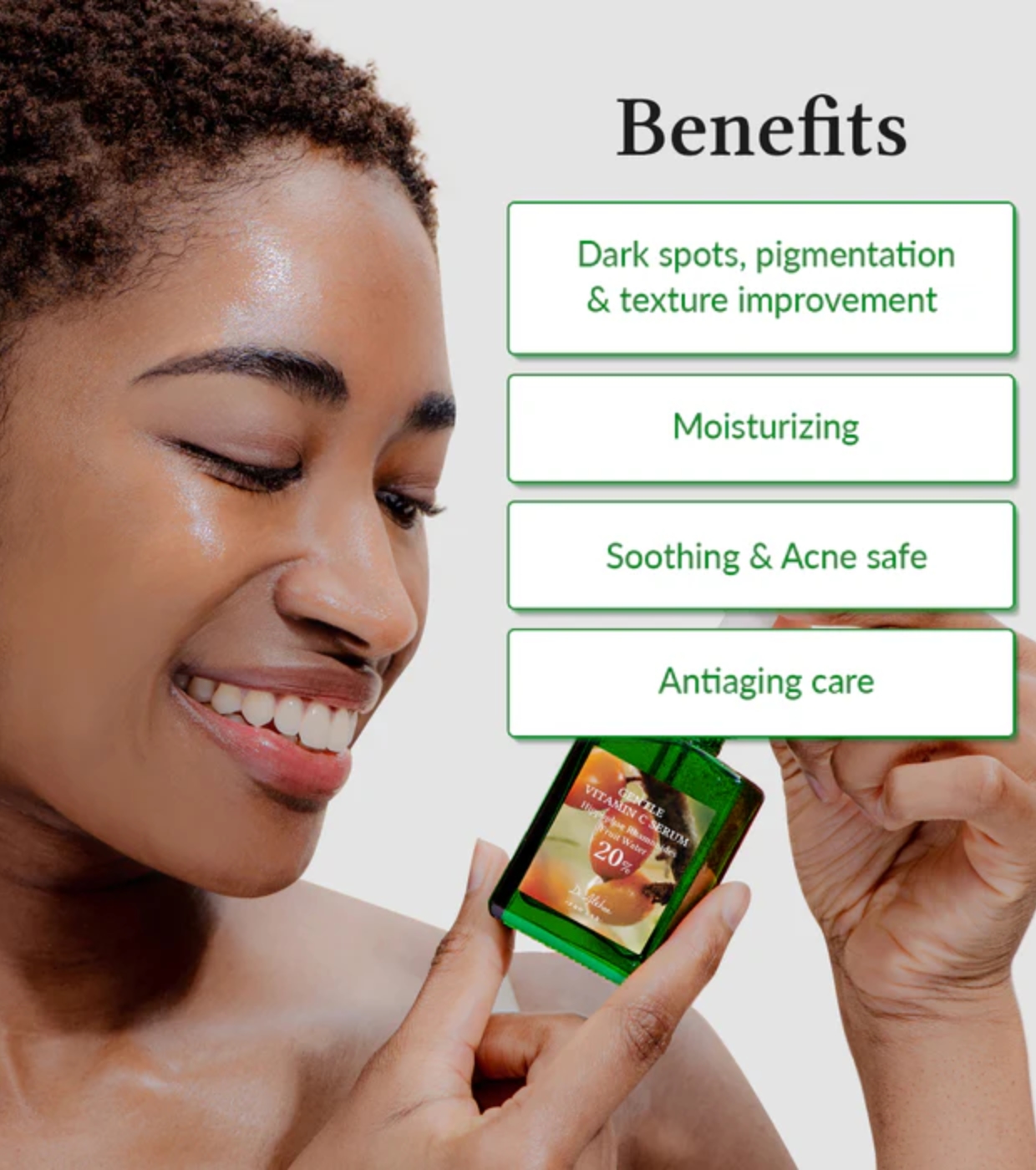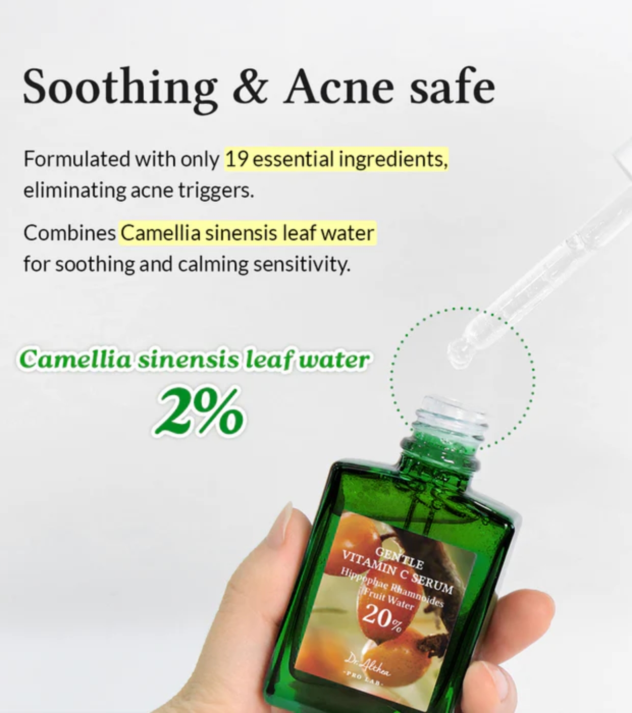 Su fórmula inteligente combina un 5% de niacinamida, un 20% de extracto de Hippophae rhamnoides (rico en vitamina C natural) y un 2% de agua de hoja de té verde, para combatir manchas oscuras y calmar la piel sin sobrecargarla.