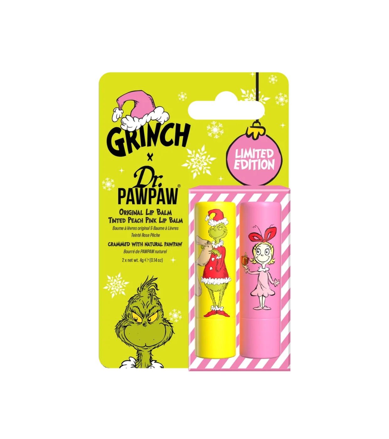 ¡Villa Quién presenta el dúo favorito de los fans del Grinch x Dr.PAWPAW! Este set imprescindible combina el bálsamo labial Original sin fragancia, perfecto para hidratar y calmar los labios, con el bálsamo Rosa Melocotón con color, ideal para aportar un toque sutil, cálido y luminoso durante toda la temporada festiva.