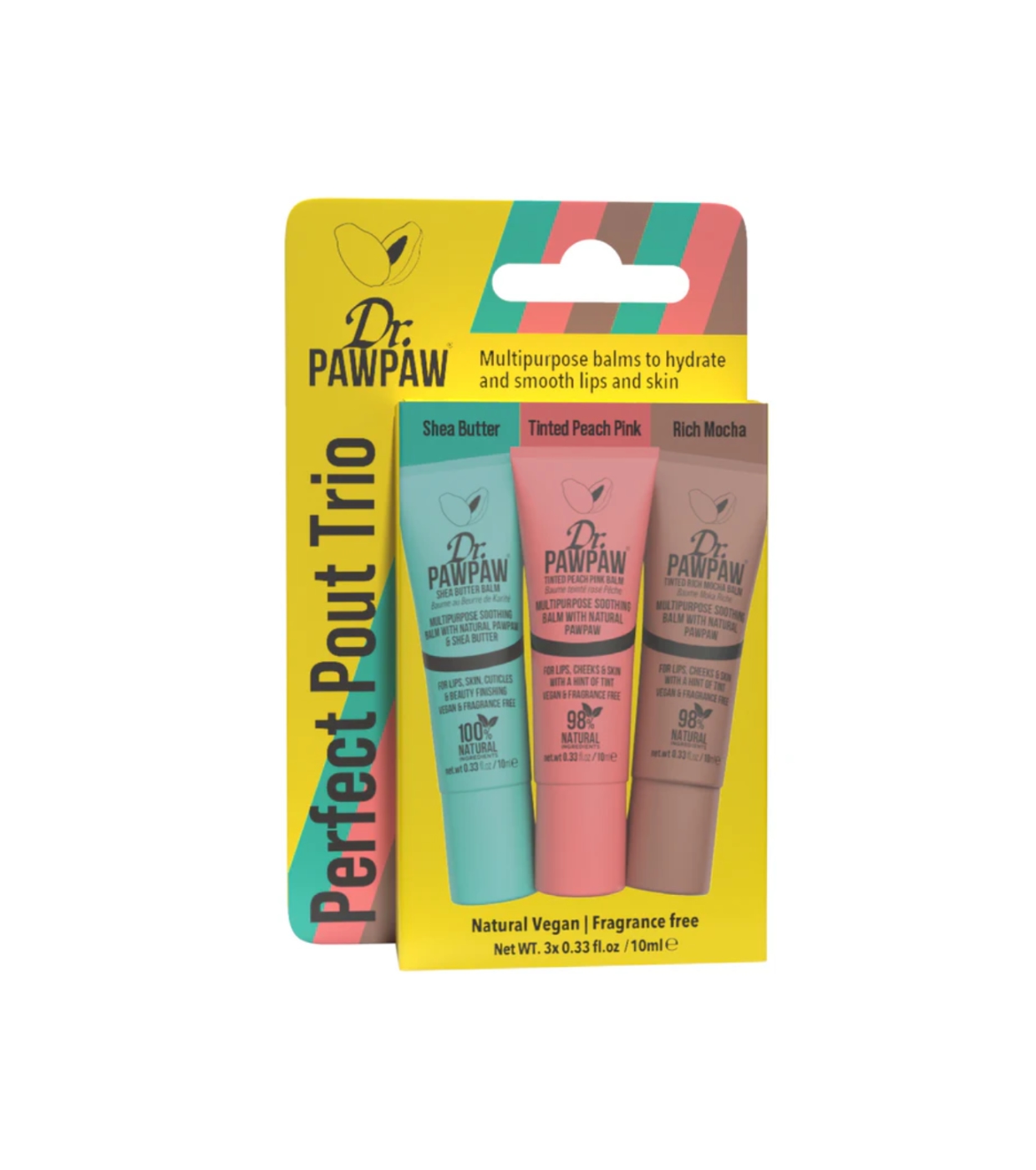 Logra unos labios irresistibles y una piel radiante con el set The Perfect Pout Trio de Dr.PAWPAW, una colección de bálsamos labiales multiusos pensada para hidratar, proteger y aportar un toque de color natural.