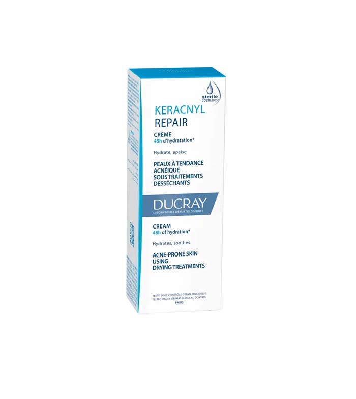 La crema Keracnyl Repair es un tratamiento hidratante que alivia la piel reseca por un tratamiento antiacné.