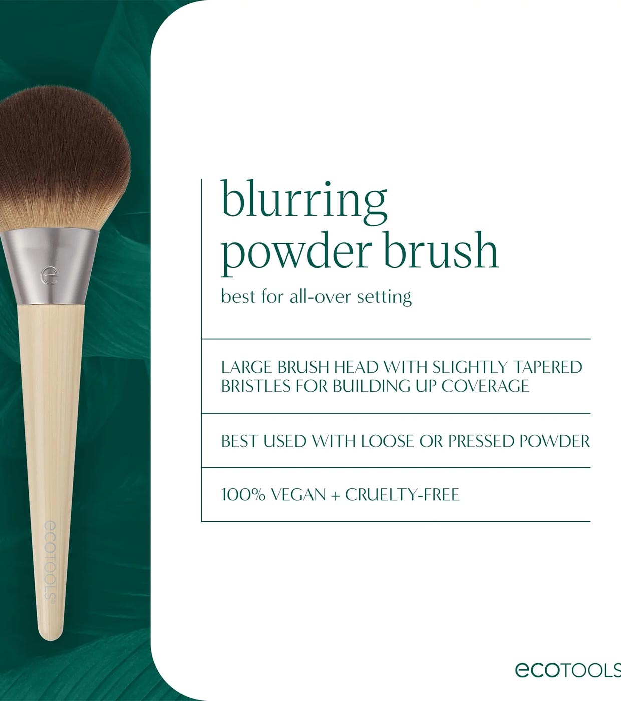 La brocha para polvos EcoTools Blurring Powder Makeup Brush tiene un cabezal grande con cerdas sintéticas esponjosas para crear una cobertura magnífica y total y conseguir una imagen más natural.