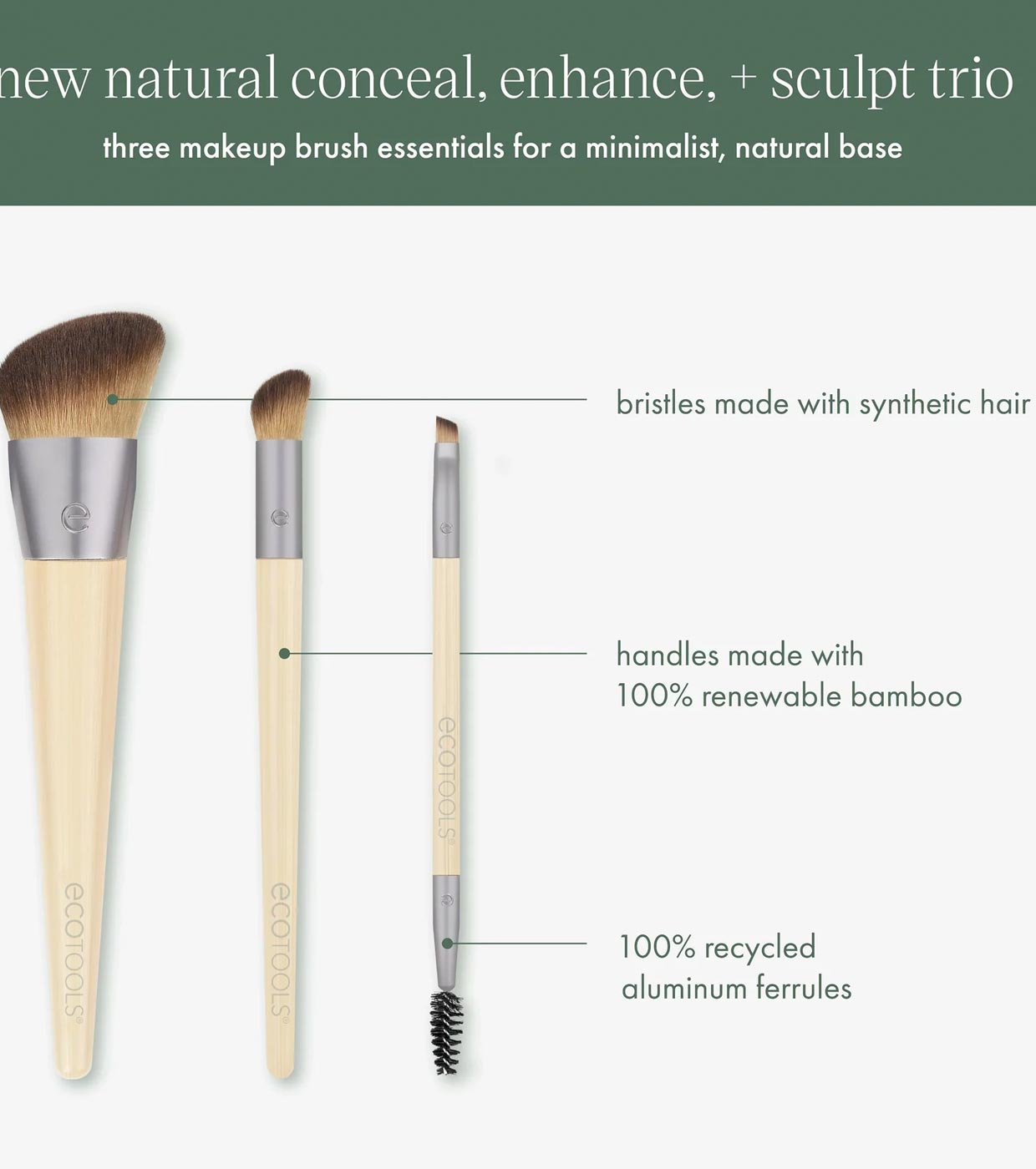 El trío EcoTools New Natural Conceal, Enhance, + Sculpt incluye todas las brochas de maquillaje esenciales para un makeup natural.