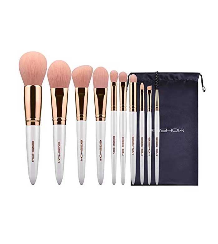 El set está formado por pinceles para base, corrector, polvos y sombras de ojos, puedes guardarlos en la bolsa con cordón lavable incluida.