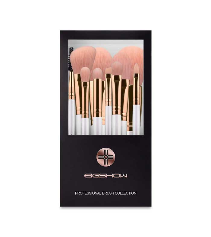 Este set de brochas veganas de Eigshow de 10 piezas está hecho de nanofibras de alta calidad con mangos de tono oro champán.