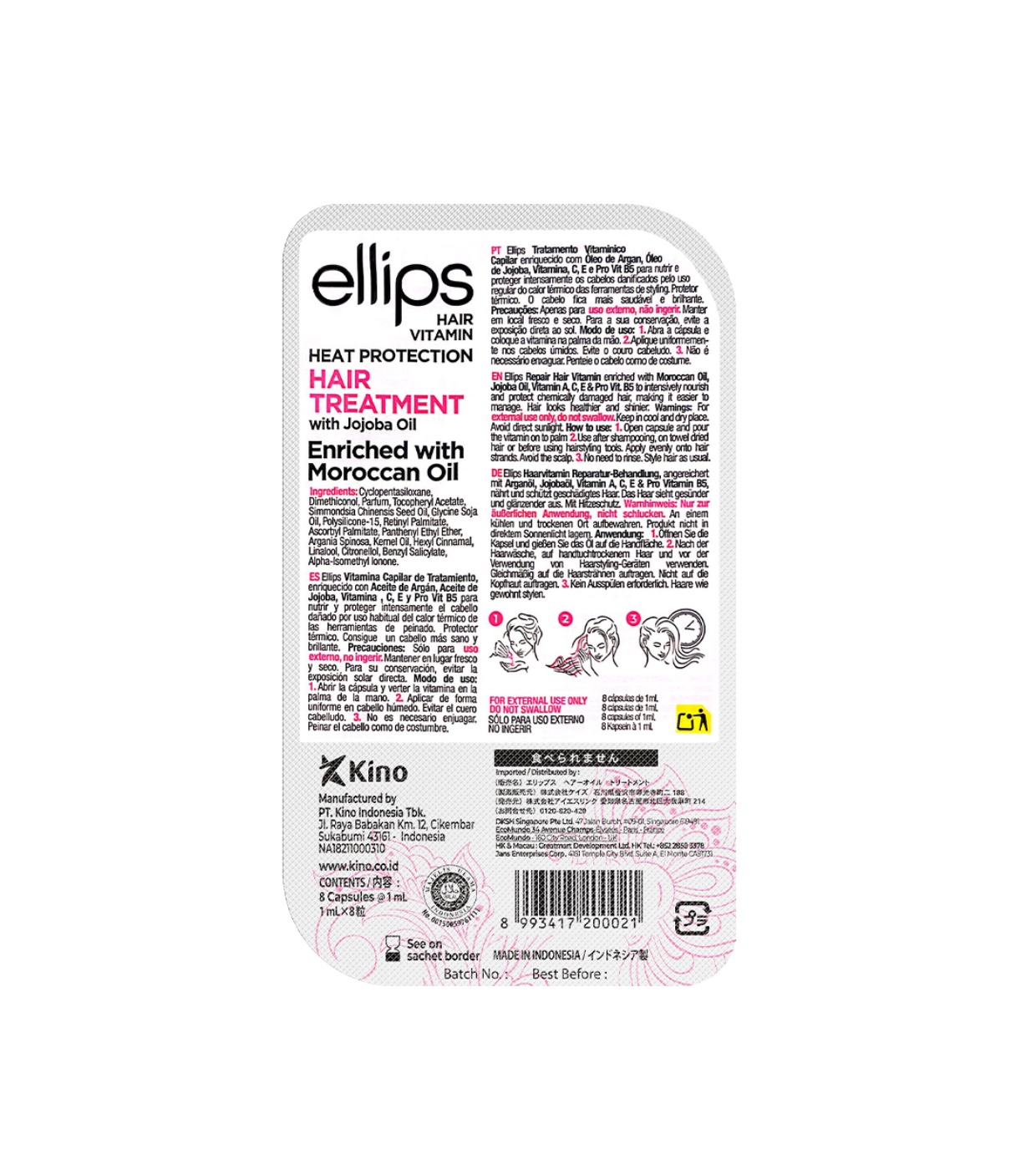 Estas ampollas de sérum están enriquecidas con Vitamina C, E y B5, aceite de argán, y aceite de jojoba para nutrir y proteger intensamente el cabello dañado por uso habitual de planchas o herramientas de calor térmico.