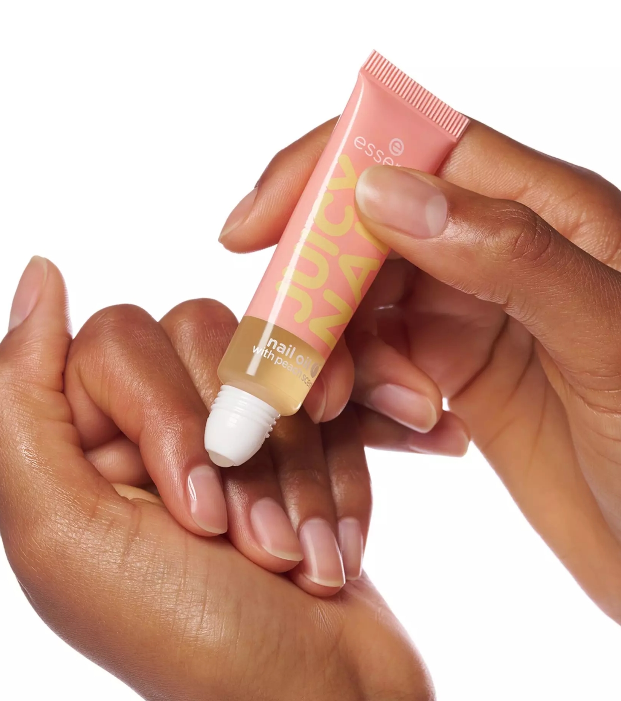 Essence Juicy Nail Oil es el aceite nutritivo en formato roll-on que cuida y mima tus uñas y cutículas de forma rápida y práctica.