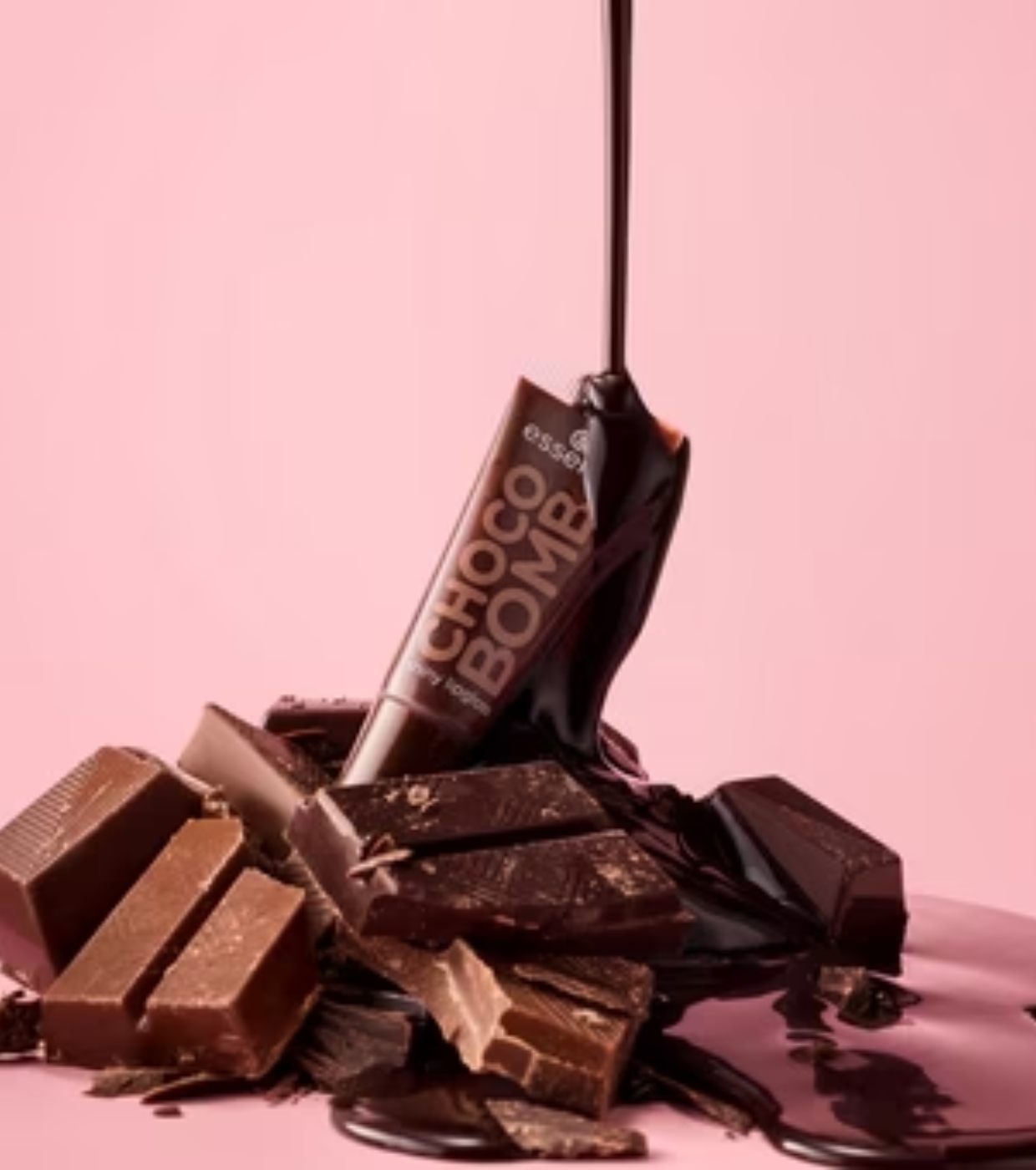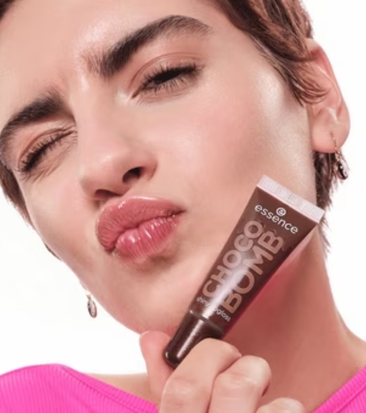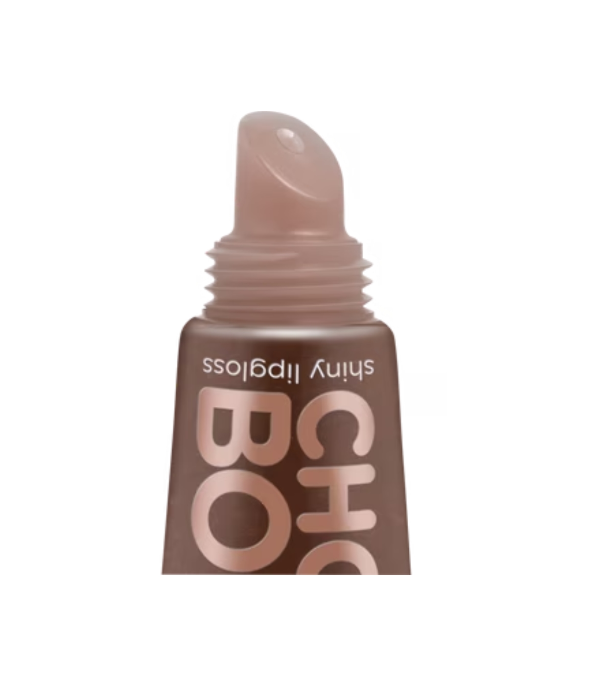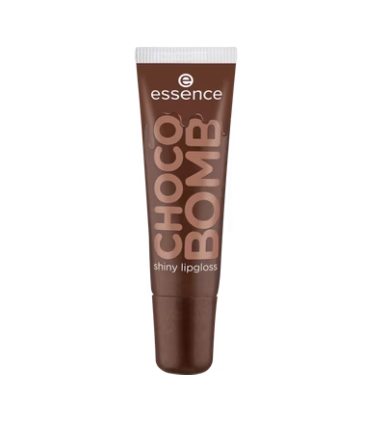 El brillo de labios CHOCO BOMB de essence es un gloss marrón con destellos dorados y un delicioso aroma a chocolate.