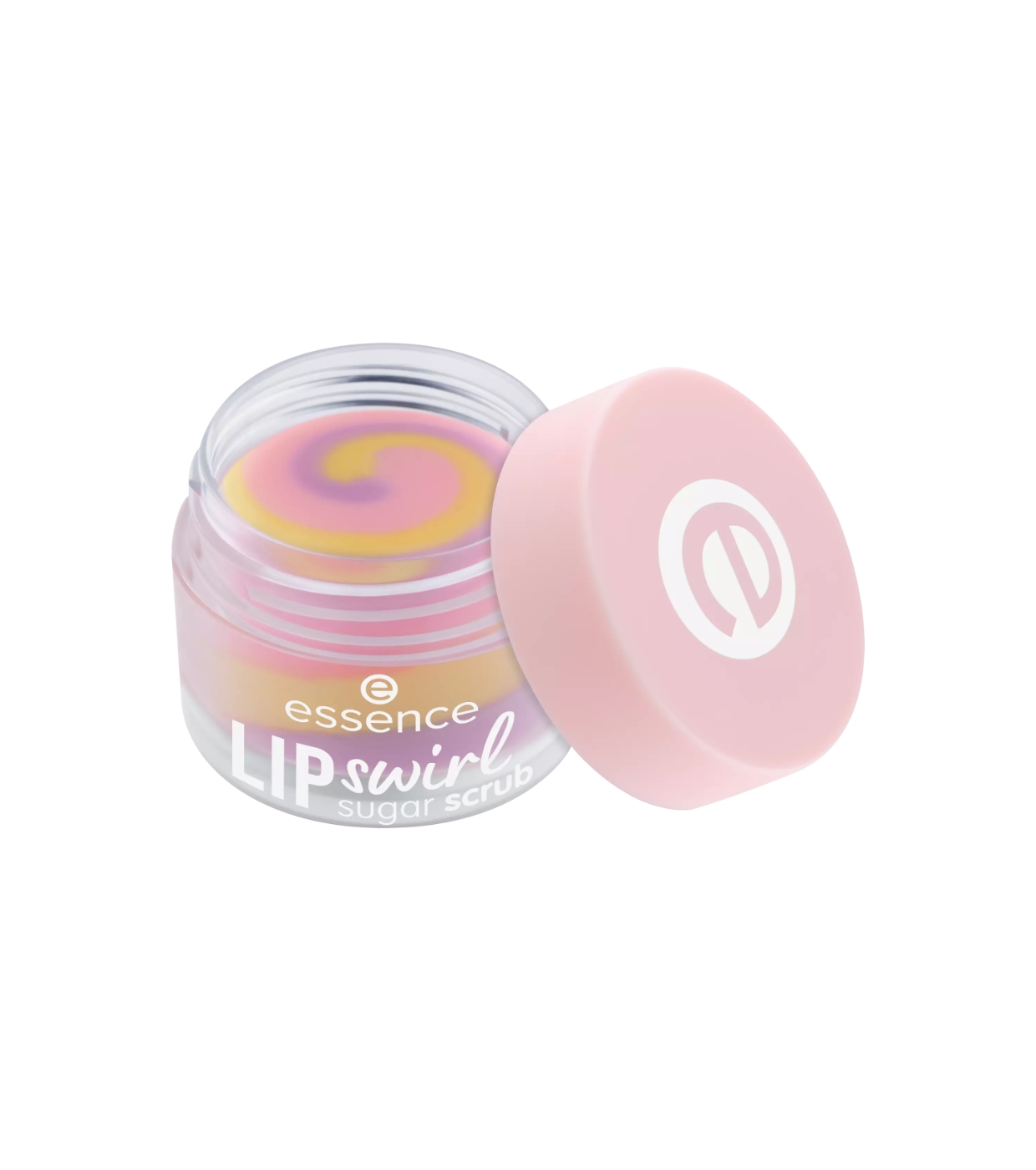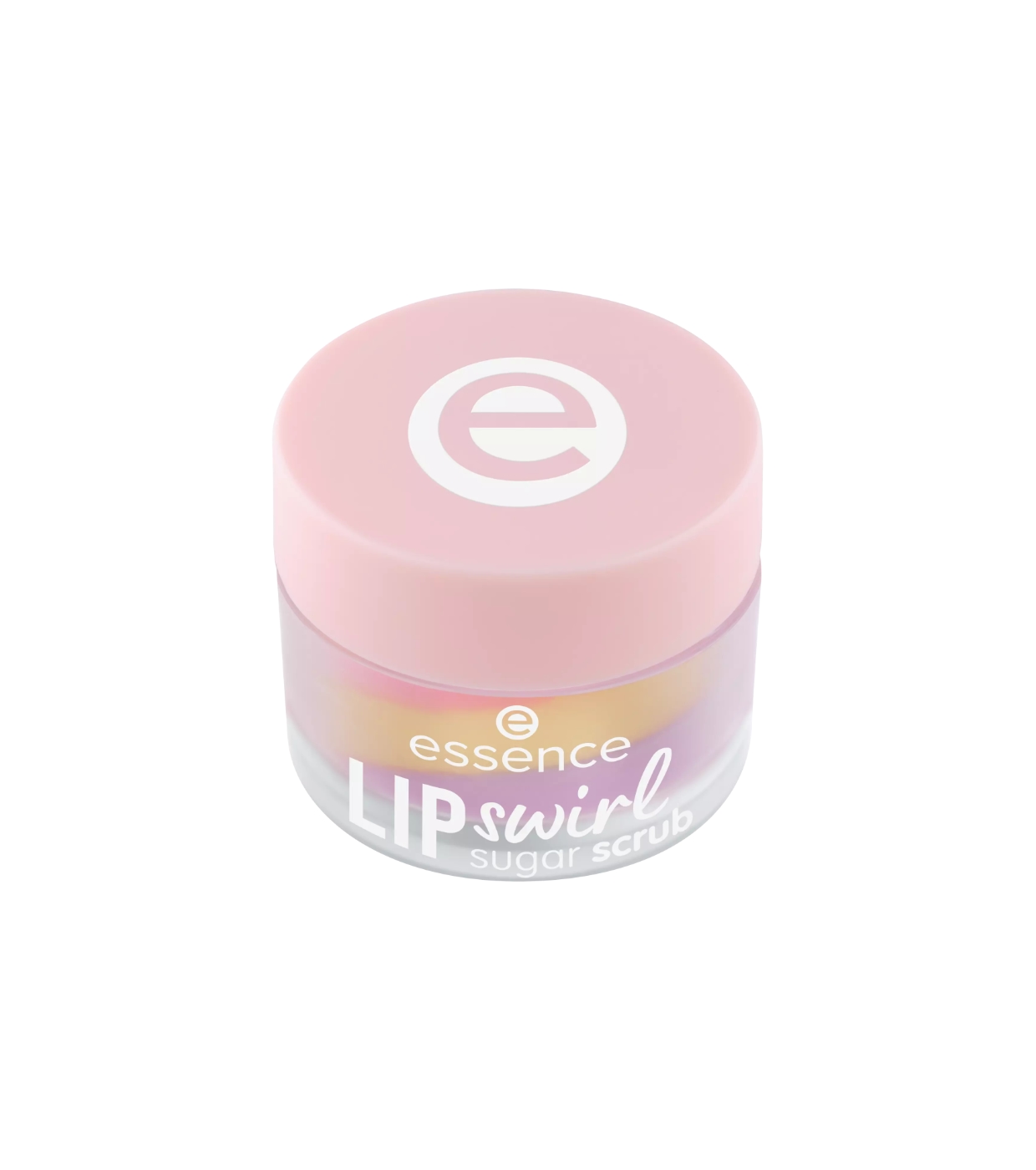 Essence Lip Sugar Scrub es un exfoliante labial divertido y eficaz con una textura en espiral de tres colores (amarillo, coral y rosa) que se transforma en un bálsamo transparente al aplicarse.