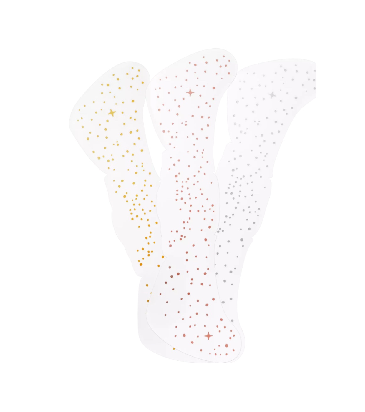 Este set incluye tres hojas de tatuajes temporales en tonos oro rosa, oro y plata, diseñados para aportar un resplandor juguetón y luminoso en solo unos segundos.