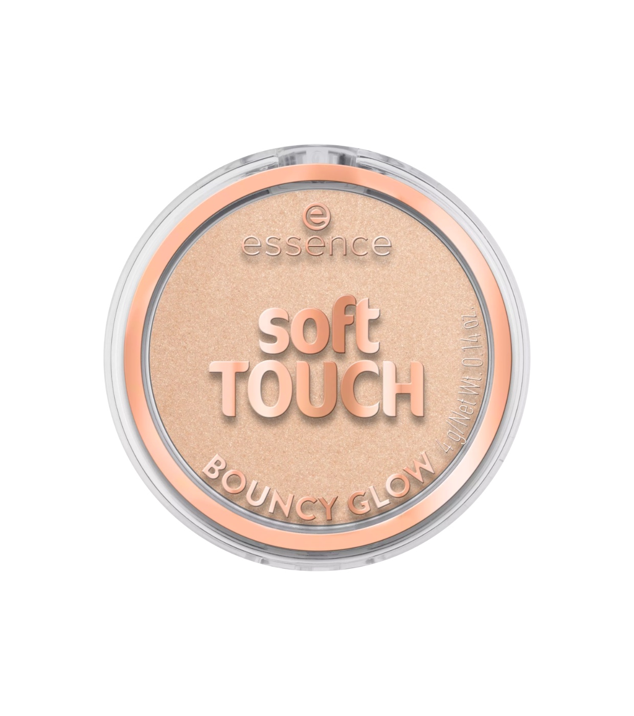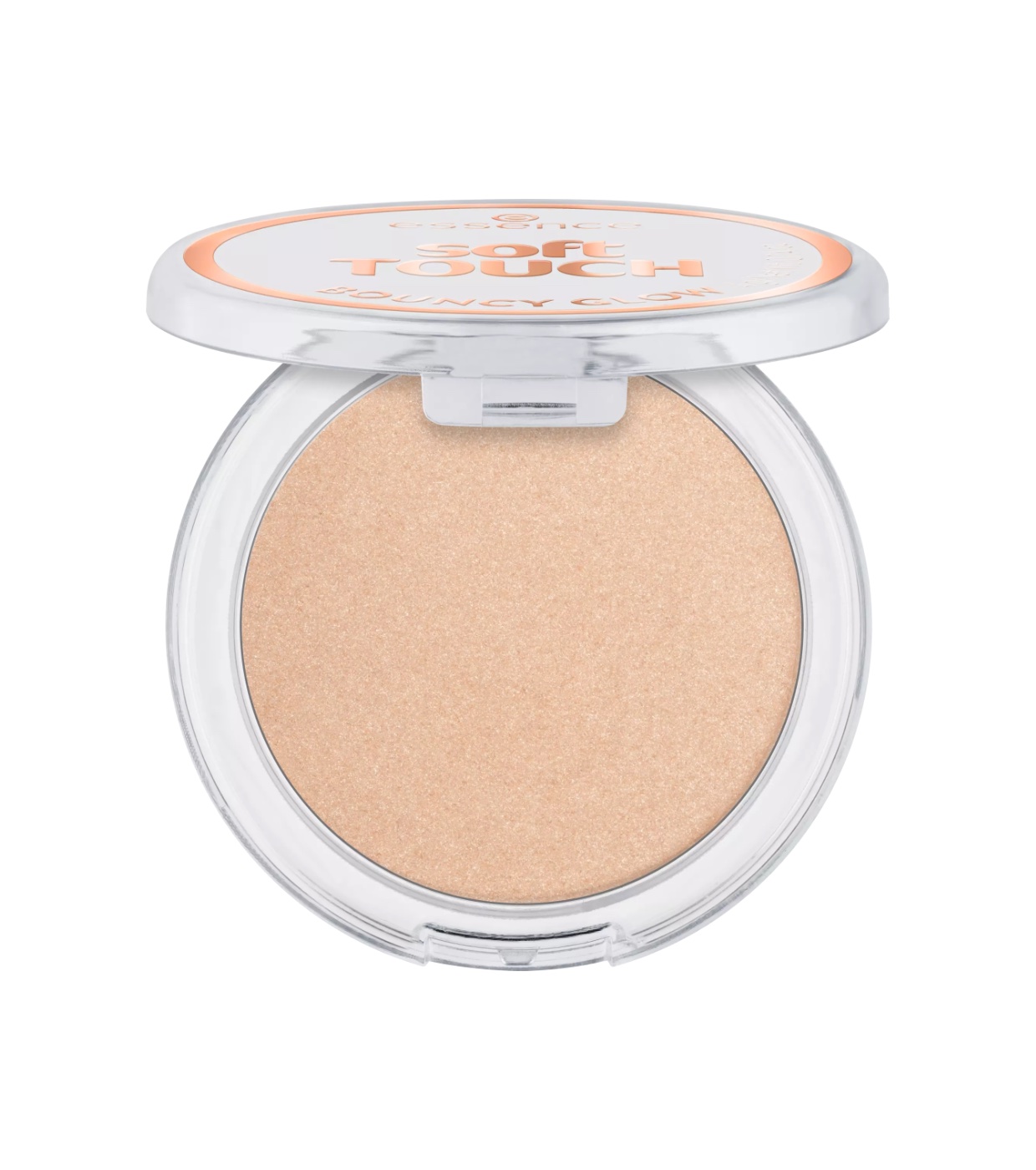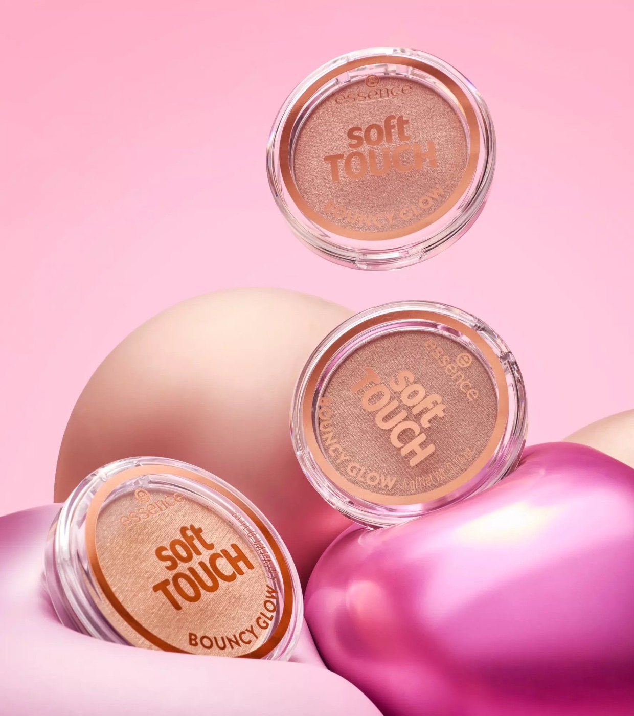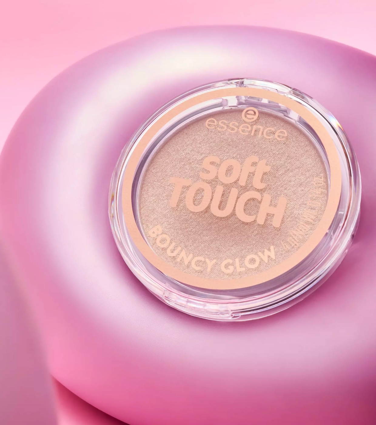 Essence Soft Touch Bouncy Glow es un iluminador innovador con una textura flexible y sensorial que se transforma en un acabado empolvado y sedoso al aplicarlo sobre la piel.