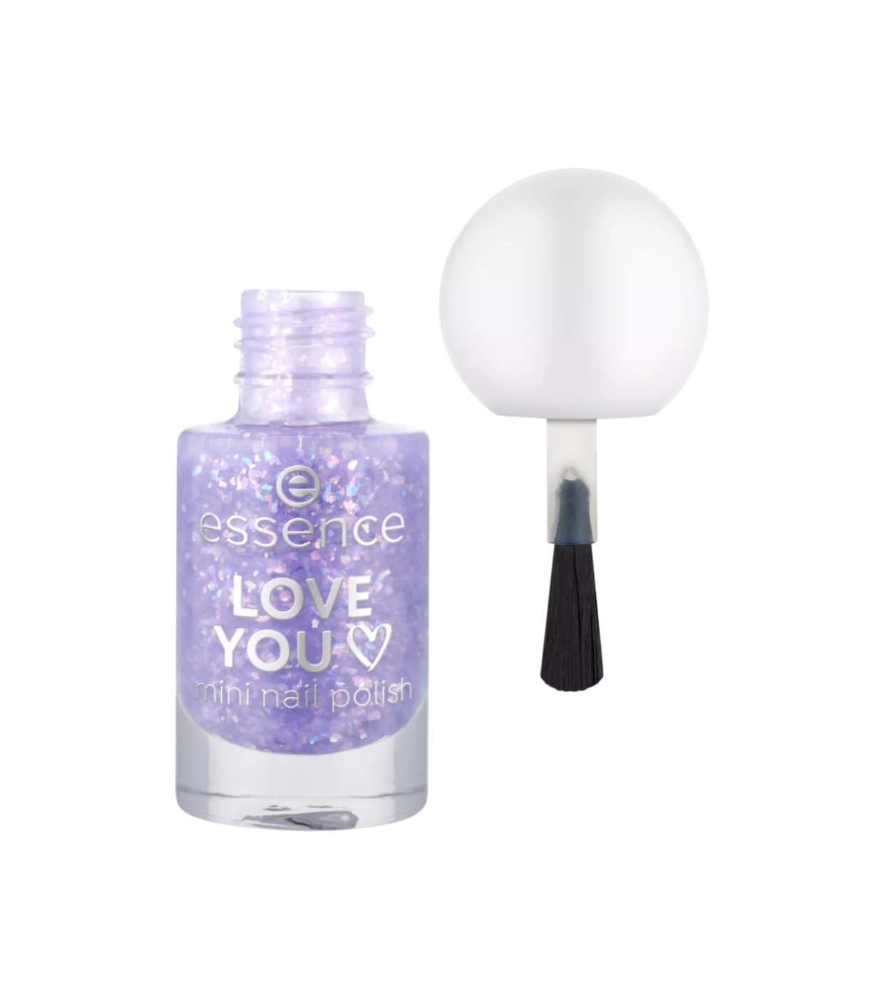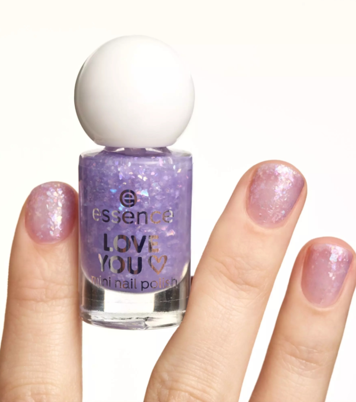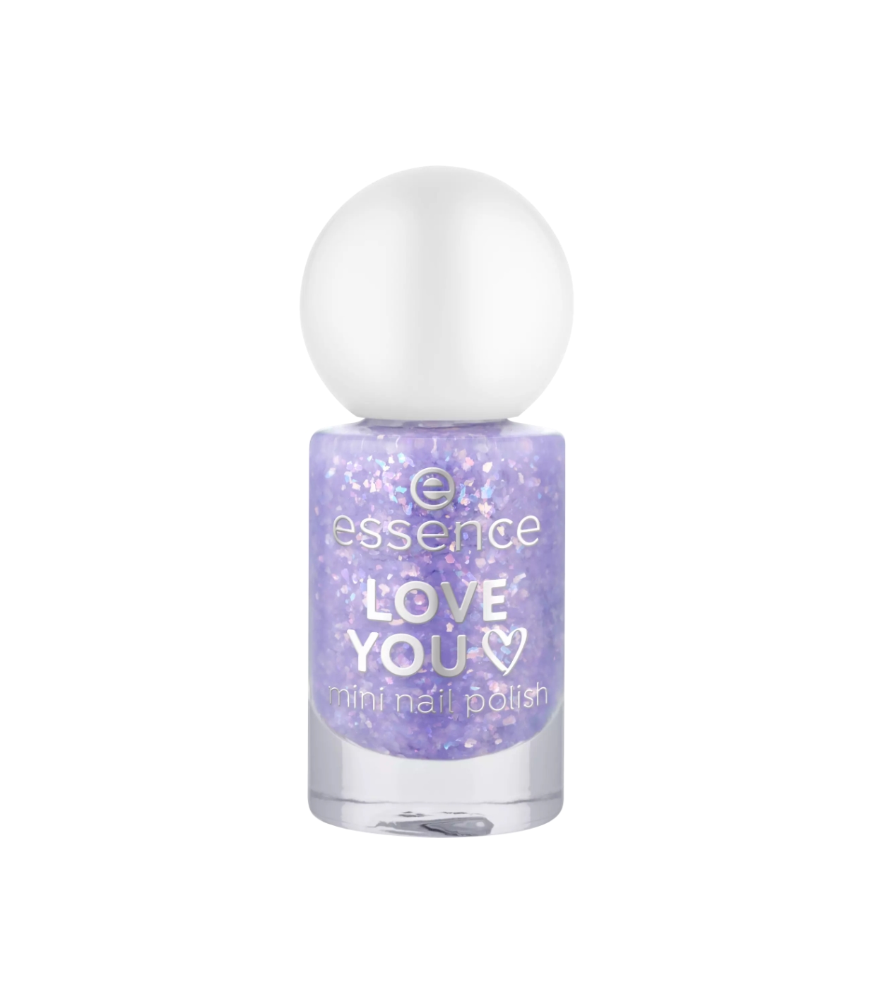 El mini esmalte de uñas Love You 13 de essence tiene un tono lila con partículas de confeti holográfico que crean un brillo multidimensional espectacular.