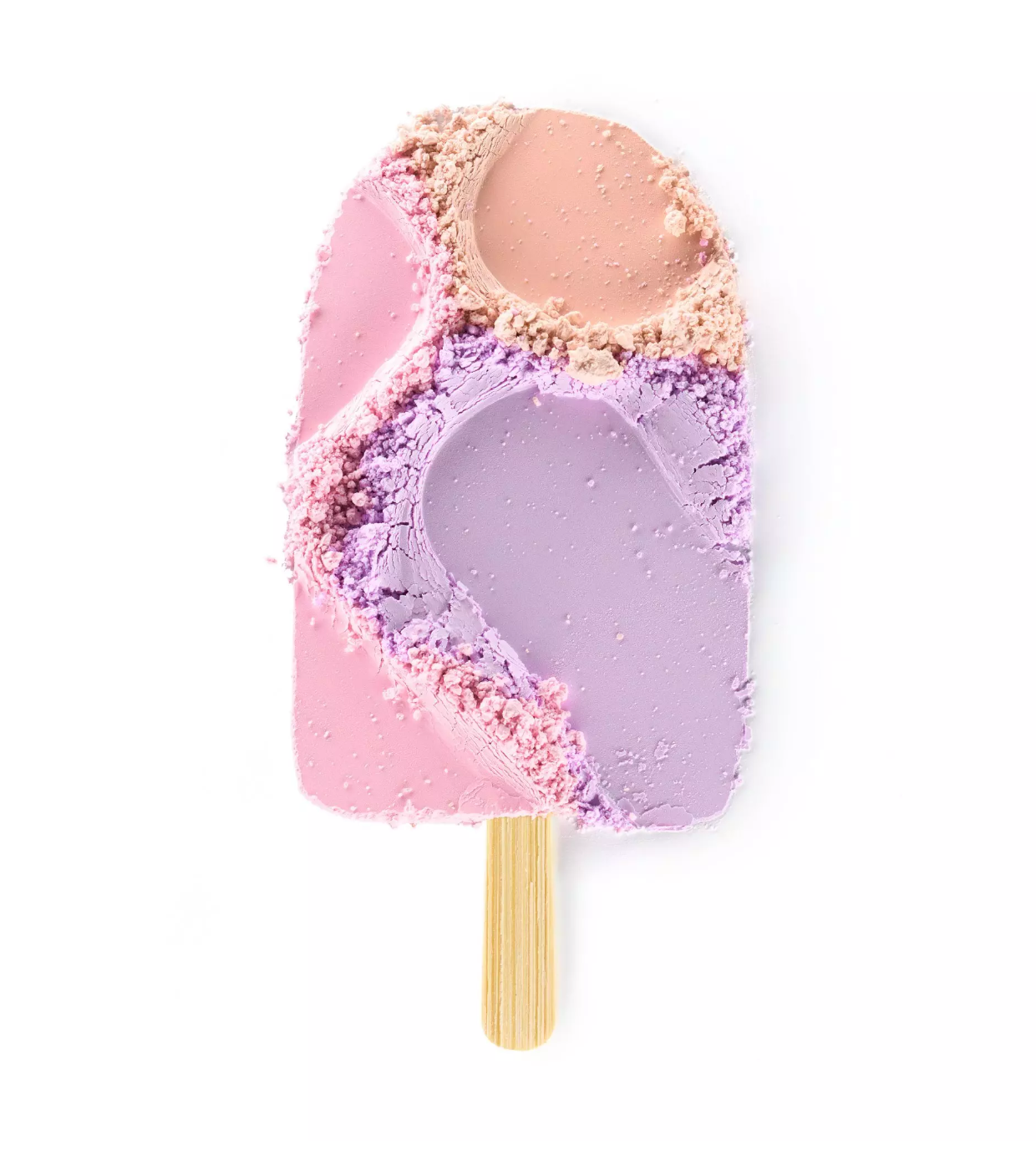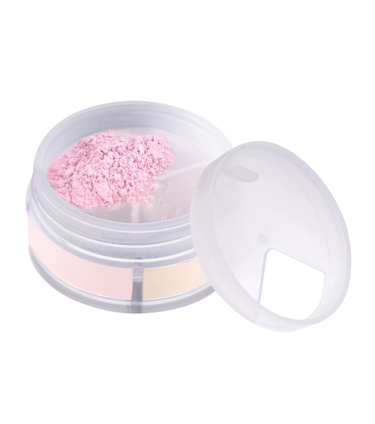 El bote incluye tres polvos sueltos diferentes para distintos usos: un polvo rosado y uno melocotón para iluminar el contorno de los ojos y un polvo lila para corregir los subtonos amarillos.