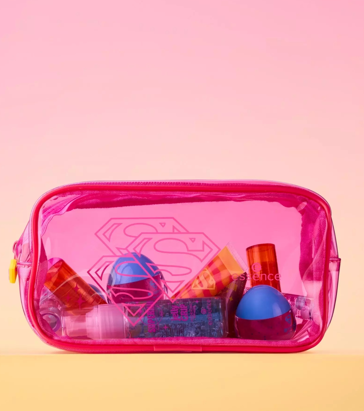 Este bolso vibrante y semitransparente presenta un audaz logotipo de Superman y un hermoso degradado de tonos rosas y azules, haciendo que tu rutina de belleza sea tan divertida como funcional.