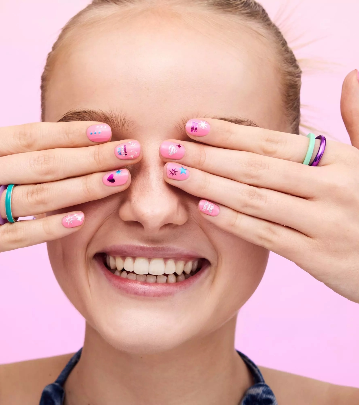 Este set incluye divertidas pegatinas holográficas en tonos rosas y azules, perfectas para crear diseños únicos y llamativos.