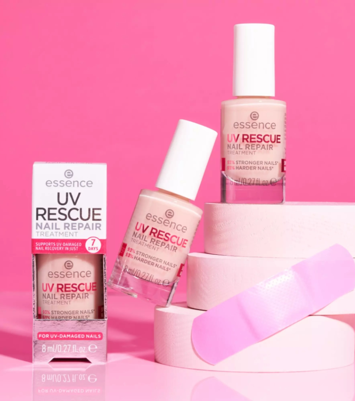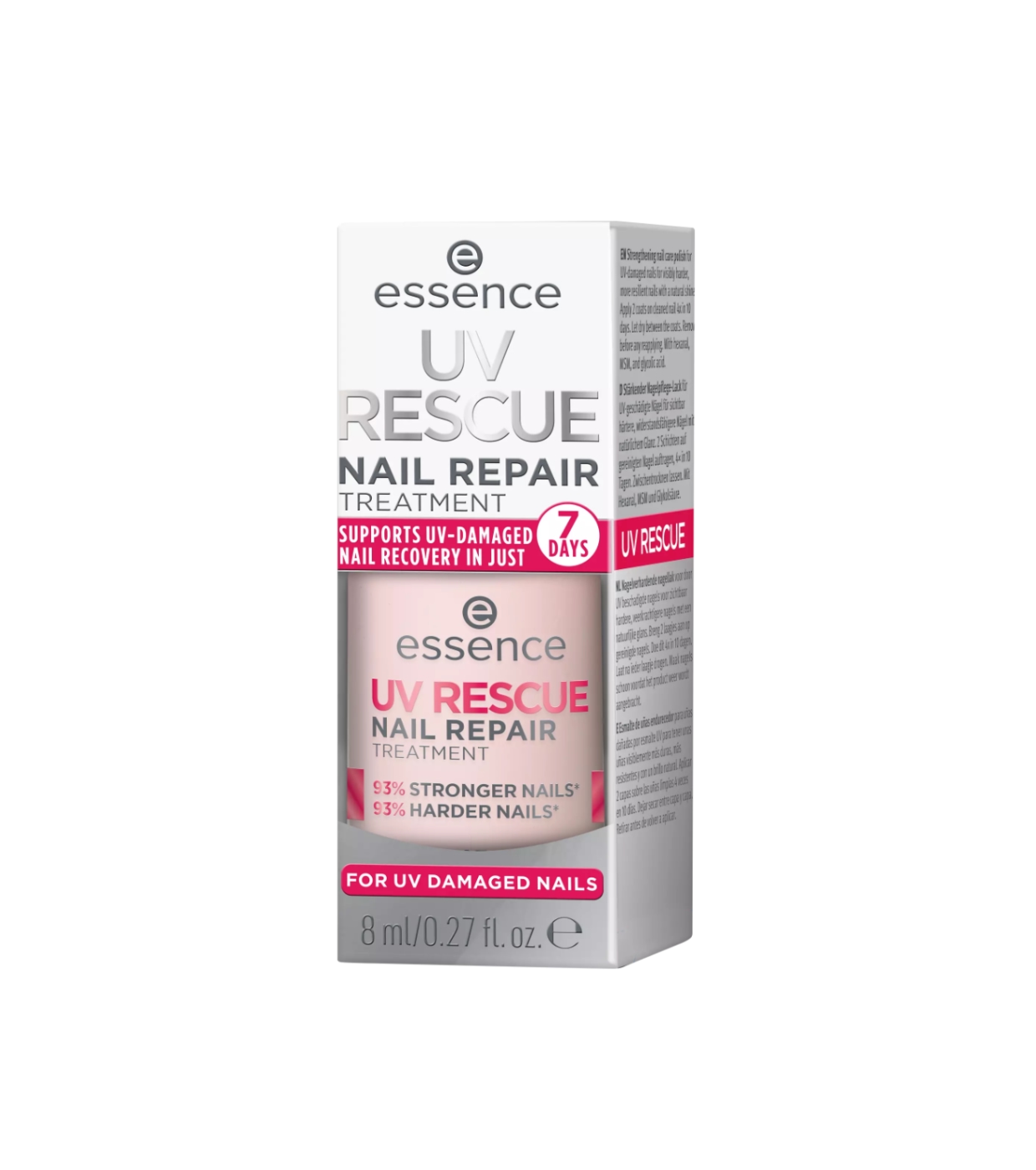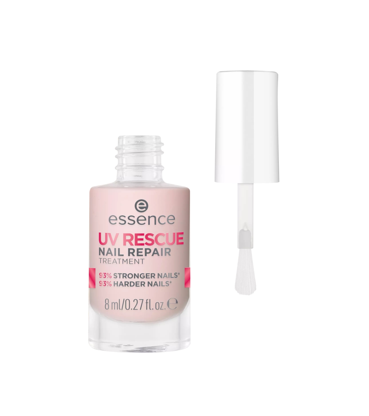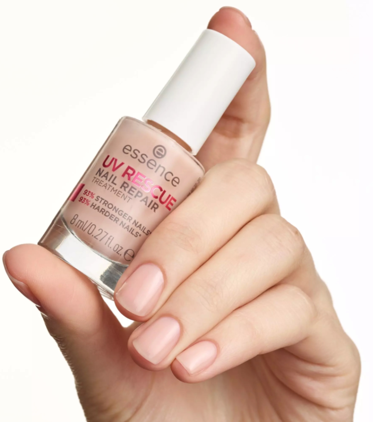 Devuelve la fuerza y el brillo a tus uñas con el tratamiento de reparación de uñas Uv Rescue de essence, el tratamiento reparador ideal tras manicuras con gel UV.