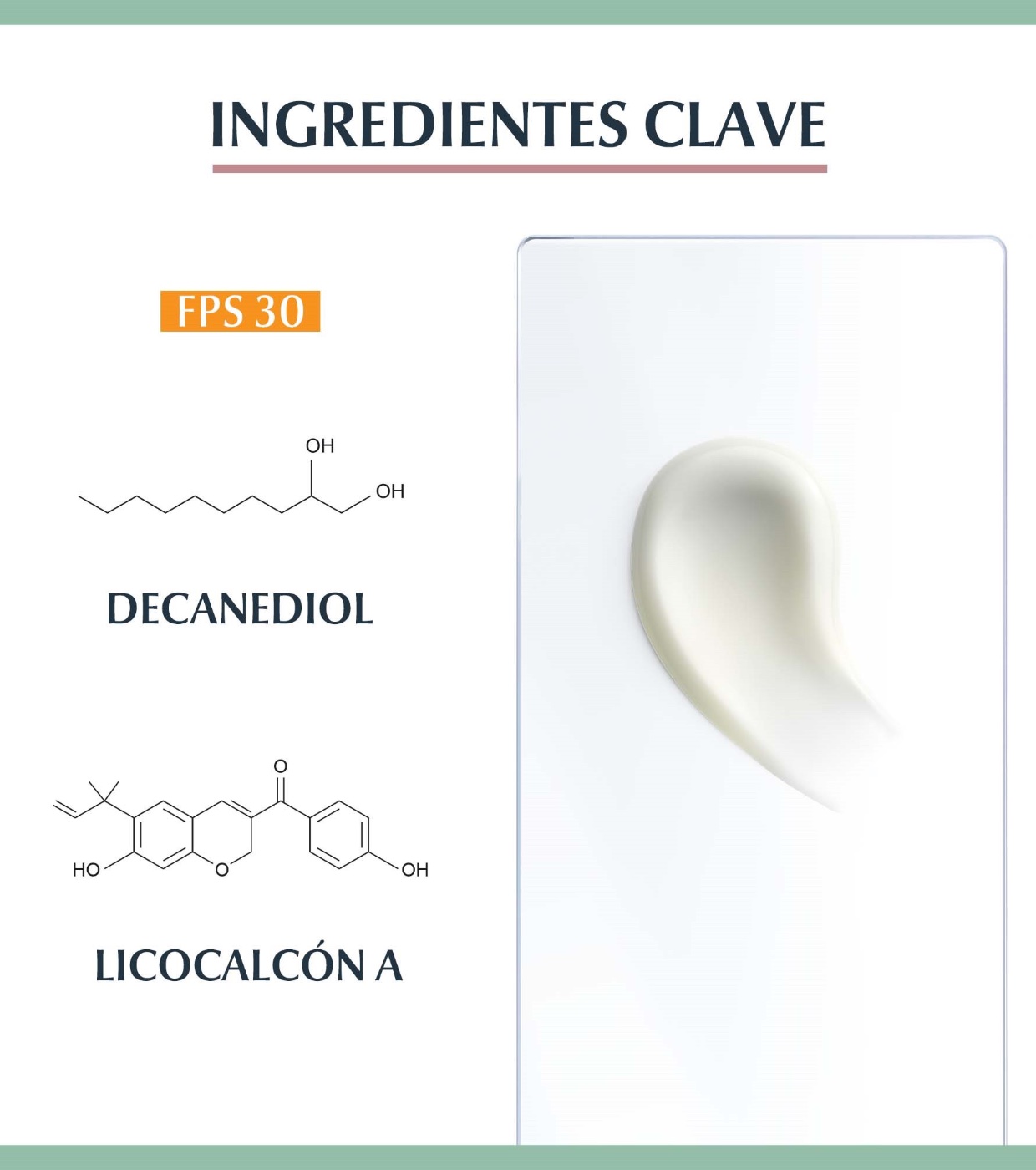 - Anti-imperfecciones: El Decanediol antibacteriano ayuda a prevenir los granos y el Licocalcón A calma la irritación.