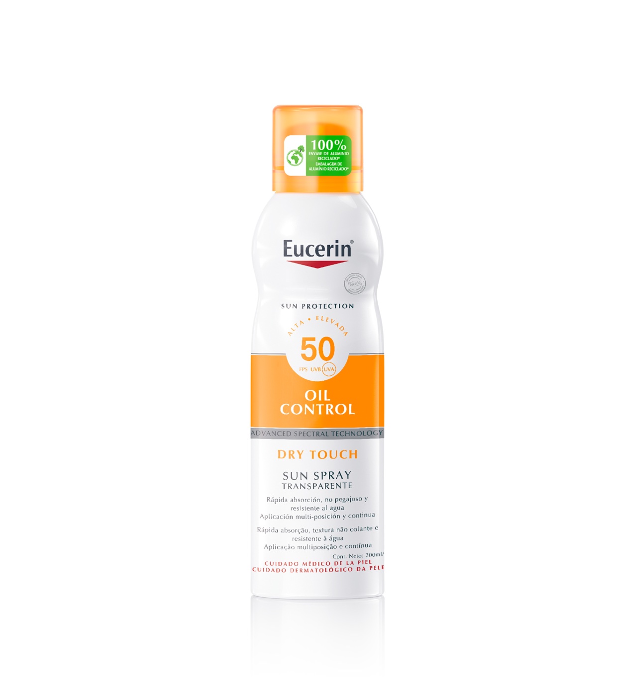Protección solar corporal en spray Oil Control SPF50 con toque seco de Eucerin.