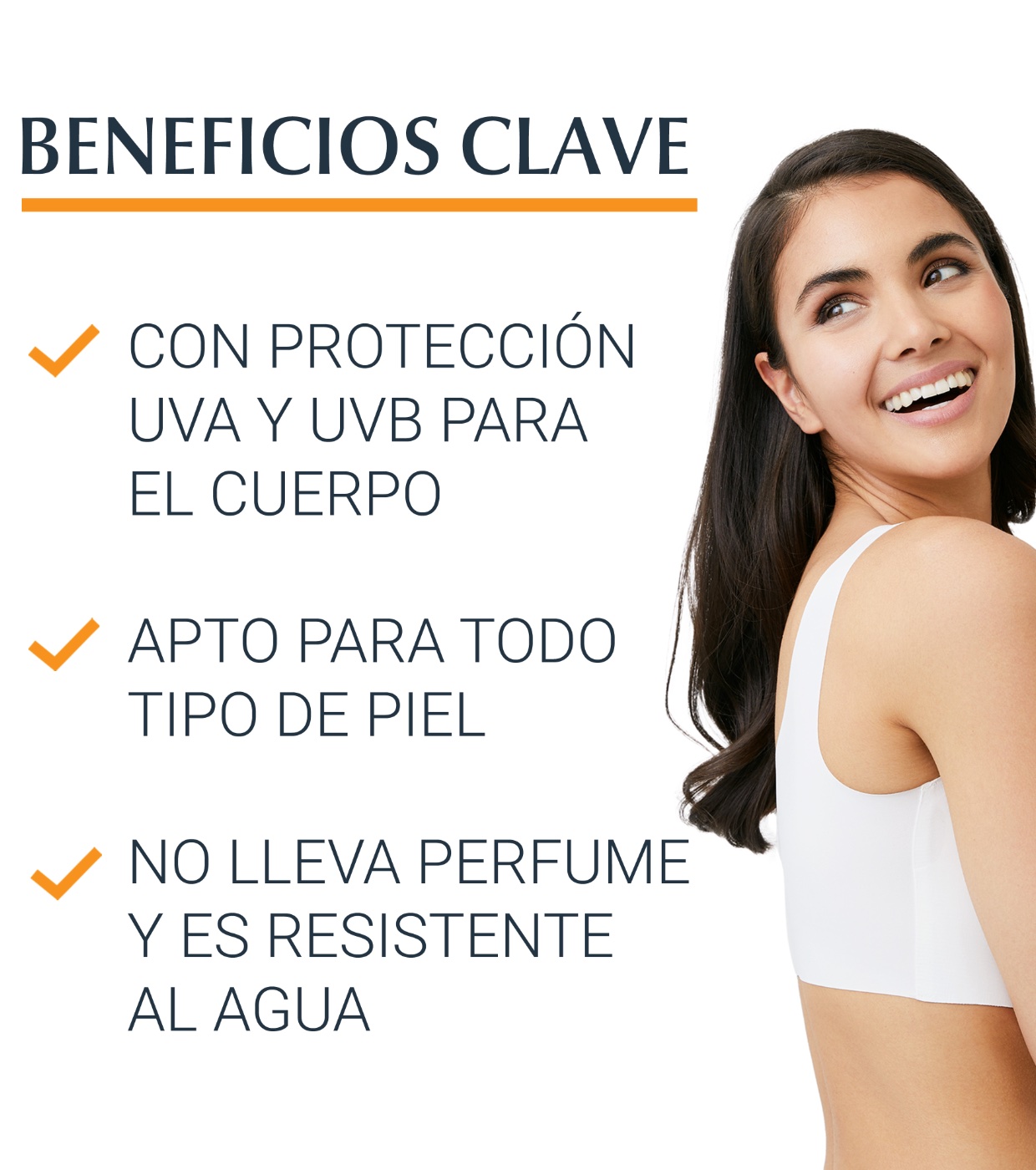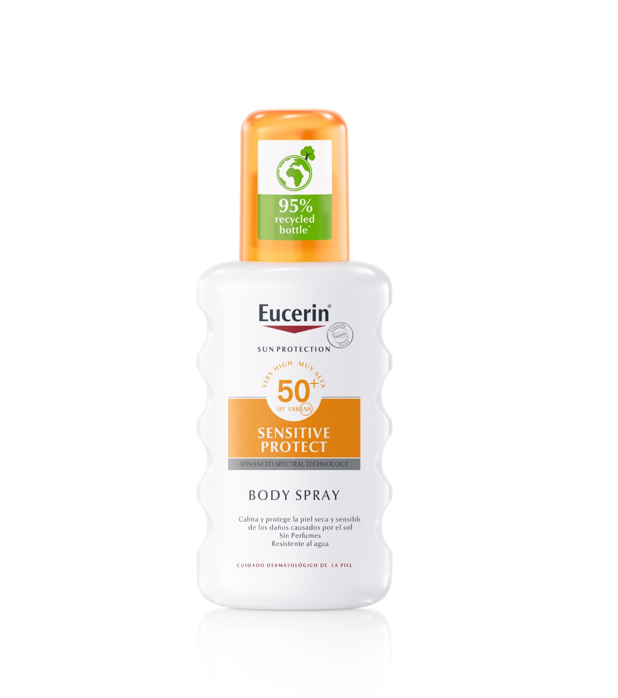 Eucerin Sun Spray Sensitive Protect FPS 50+ es un protector solar corporal en spray que calma y protege la piel sensible.