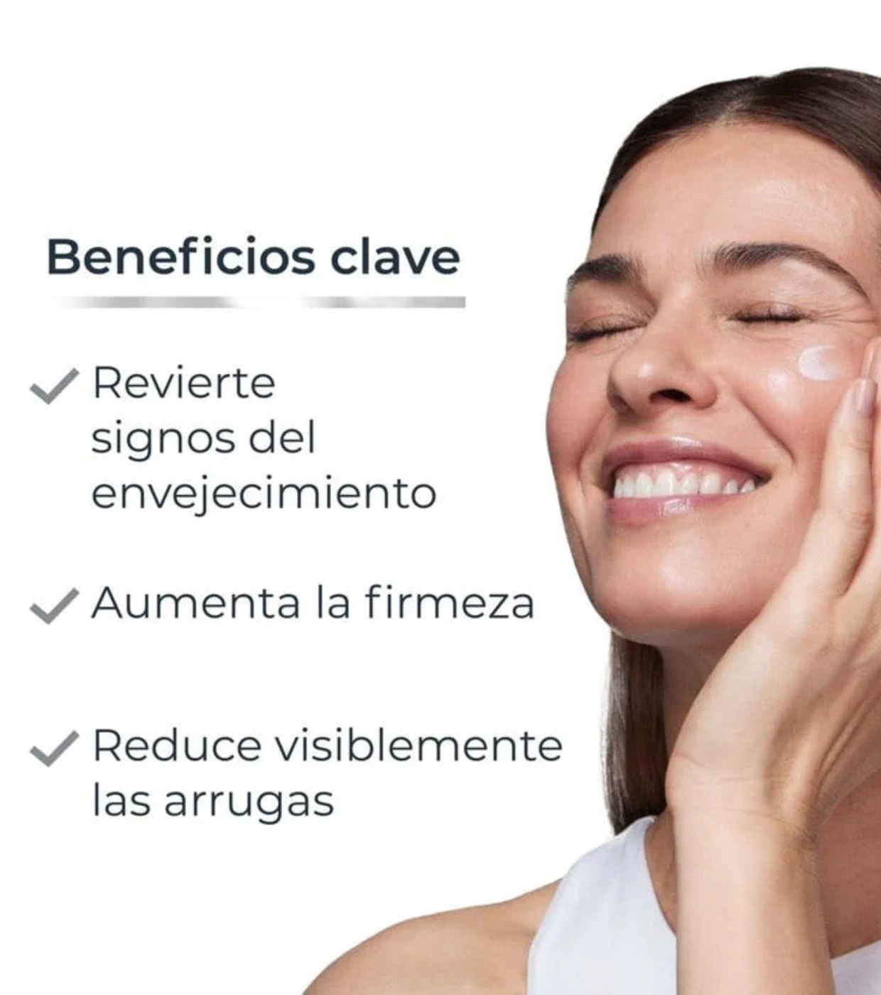 - Revierte visiblemente los signos del envejecimiento cutáneo, proporcionando beneficios como: firmeza, efecto lifting, reducción de arrugas y líneas finas, mejora en los contornos, hidratación, luminosidad, rejuvenecimiento, uniformidad y suavidad.