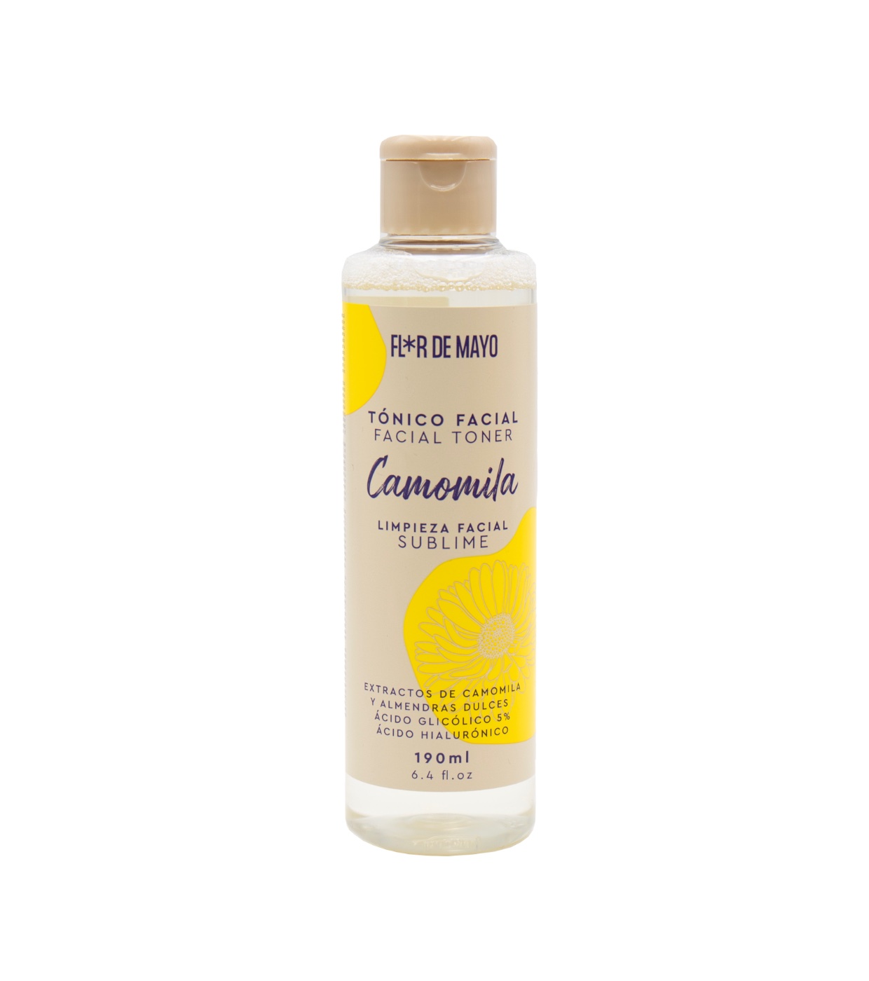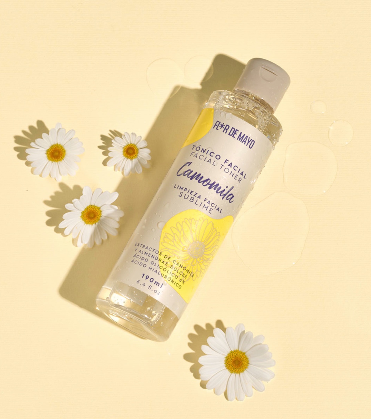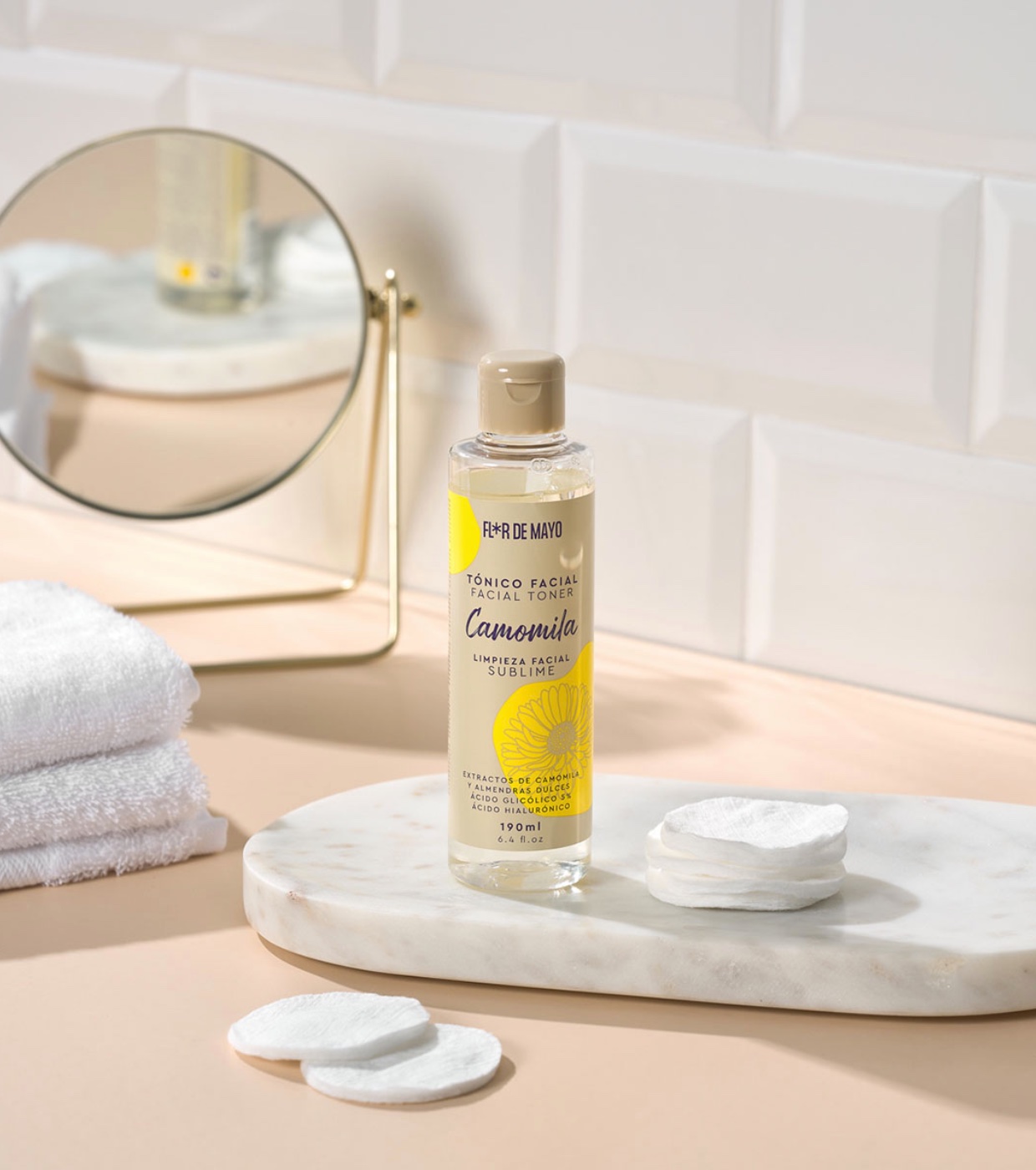 Un tónico facial elaborado con camomila y con ácido glicólico que limpia e hidrata además de revitalizar.