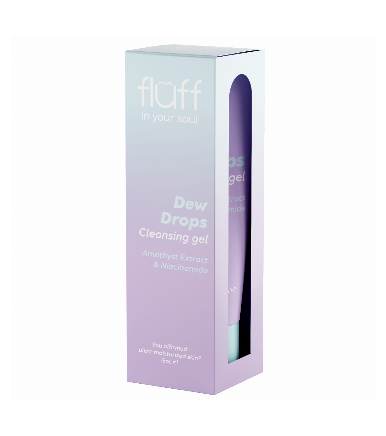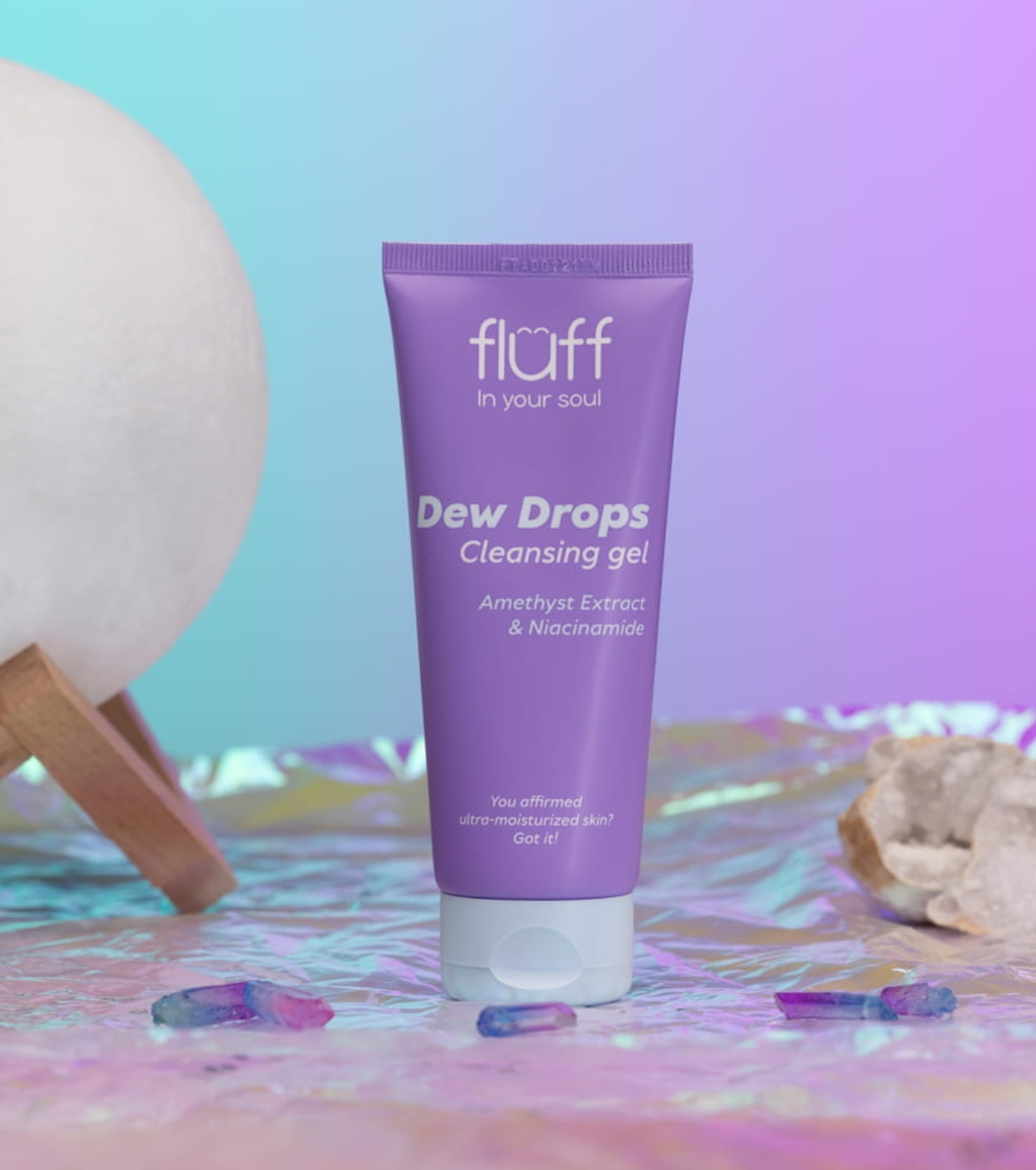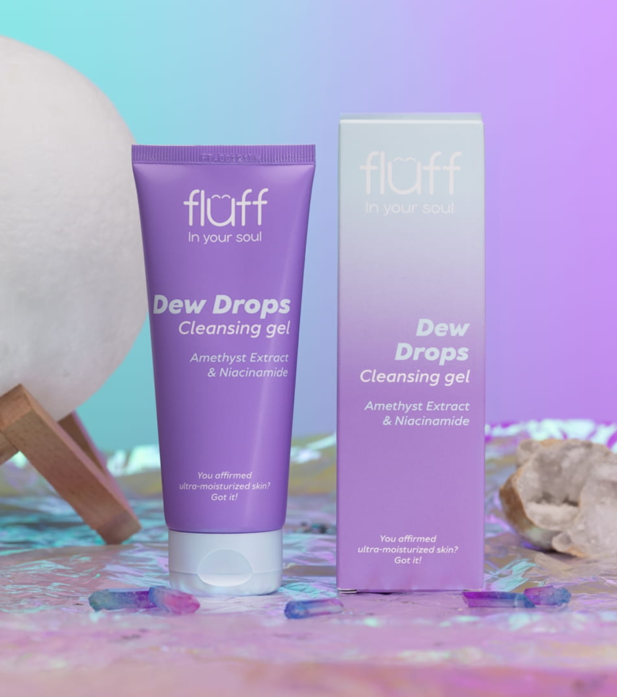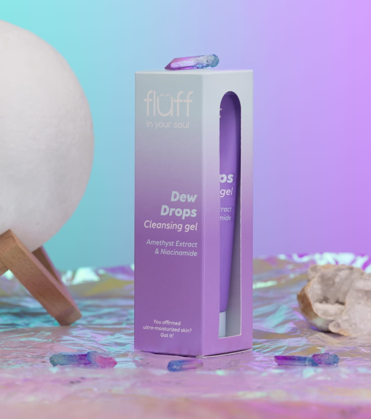 El gel limpiador facial con amatista y niacinamida Dew Drops de Fluff limpia la piel de manera suave pero eficaz, aumentando los niveles de hidratación y restaurando la elasticidad.