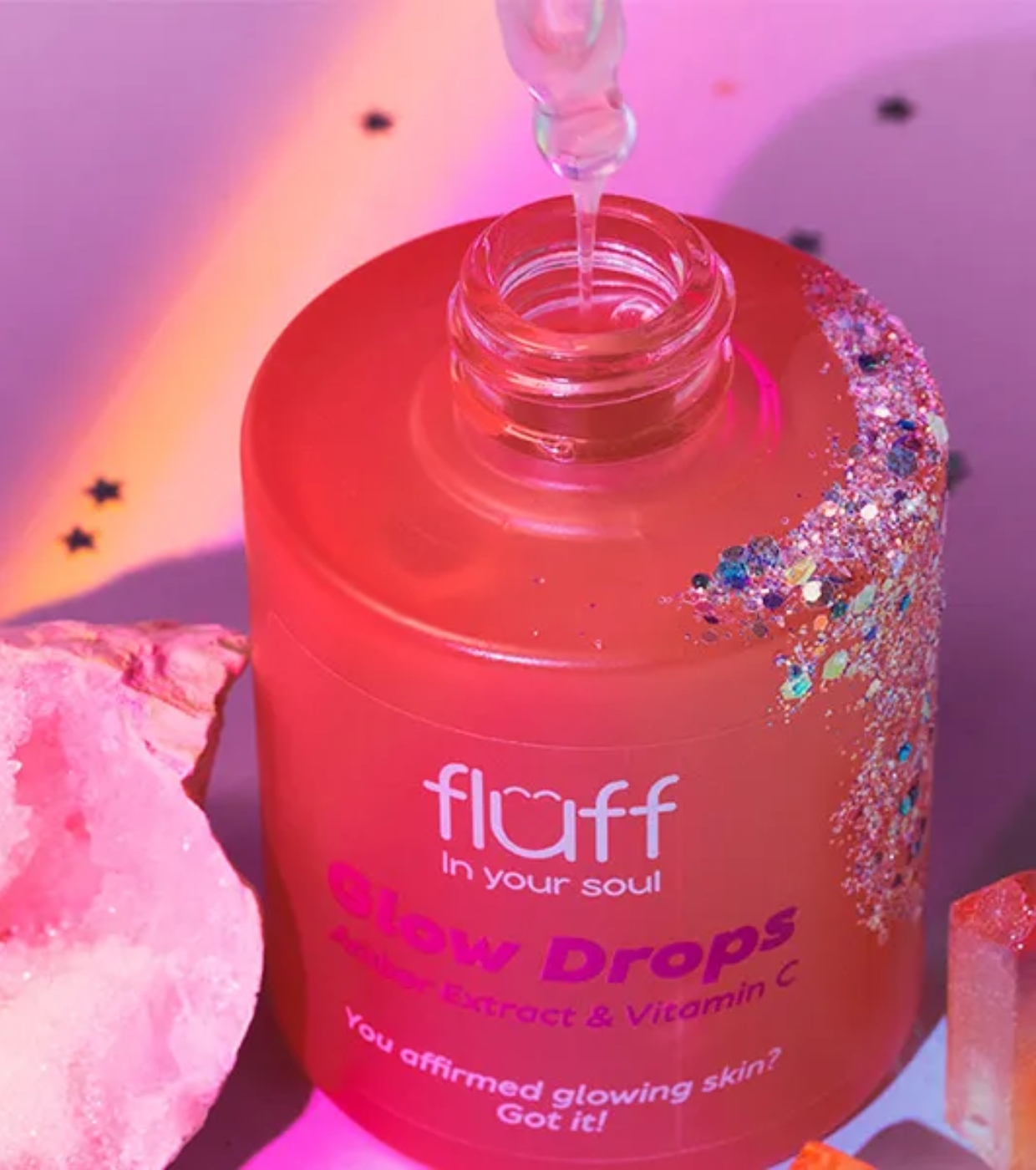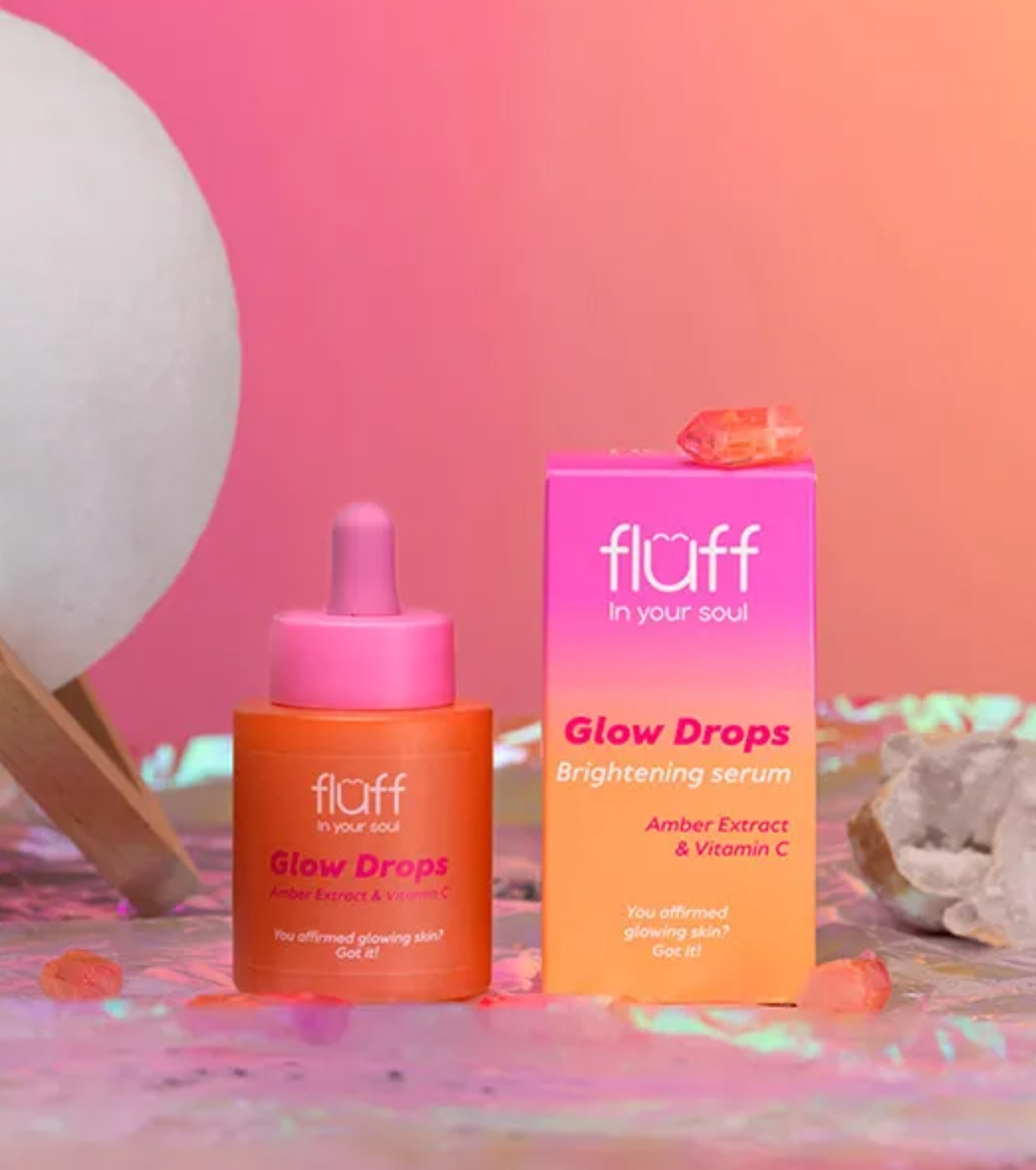 El Sérum facial iluminador con extracto de ámbar y Vitamina C Glow Drops de Fluff está diseñado para proporcionar una piel visiblemente más radiante, suave y llena de energía. ç
