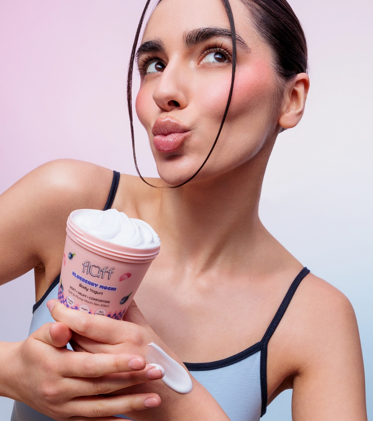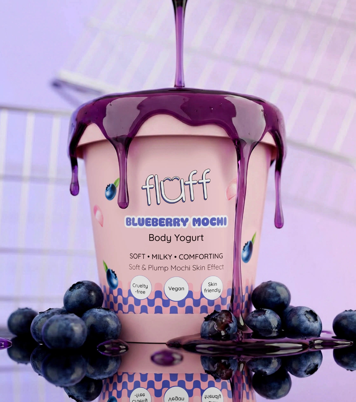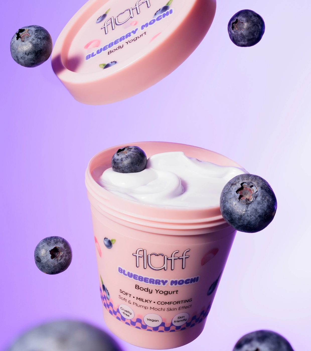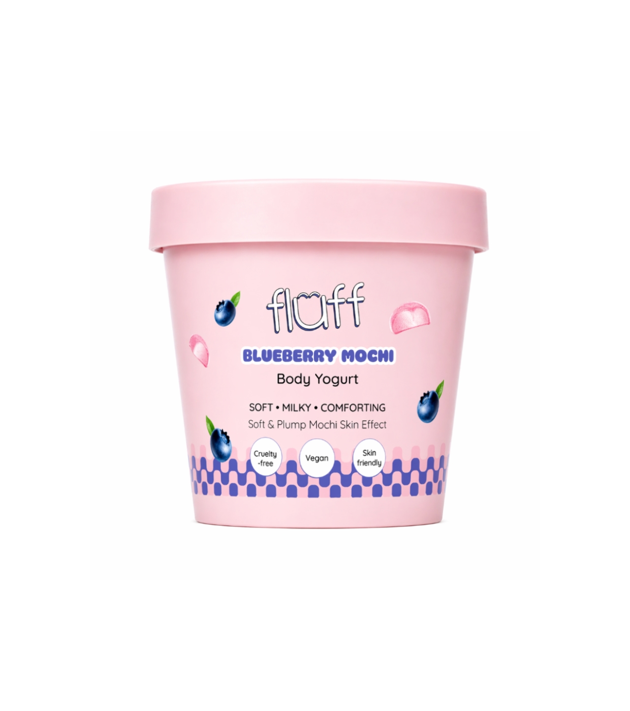 Convierte tu rutina corporal en un momento de placer con el yogur corporal Blueberry Mochi de Fluff, el yogur corporal que hidrata, suaviza y envuelve tu piel en un delicioso aroma dulce.