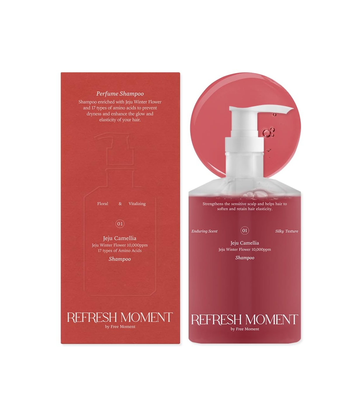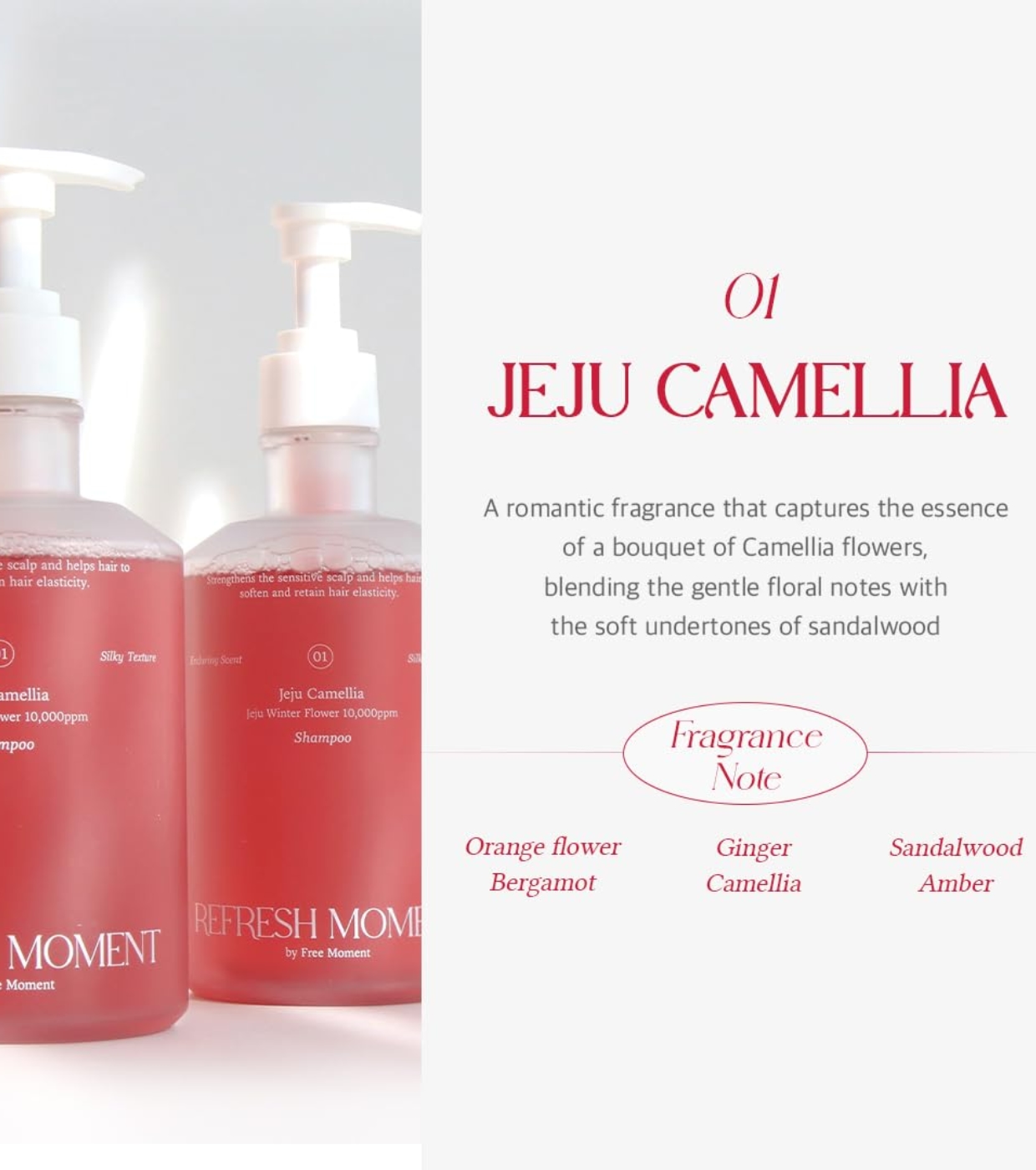Descubre el poder reparador del champú con Jeju Camellia de Free Moment, formulado con extracto de flor de camelia de Jeju y 17 aminoácidos esenciales.