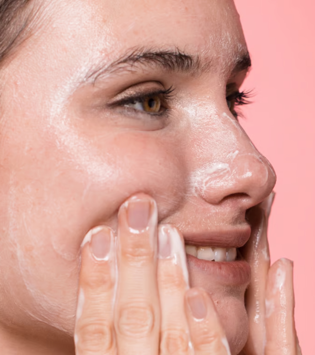 Humedece el rostro y aplica 2 pulsaciones del Rose Quartz Facial Cleanser.