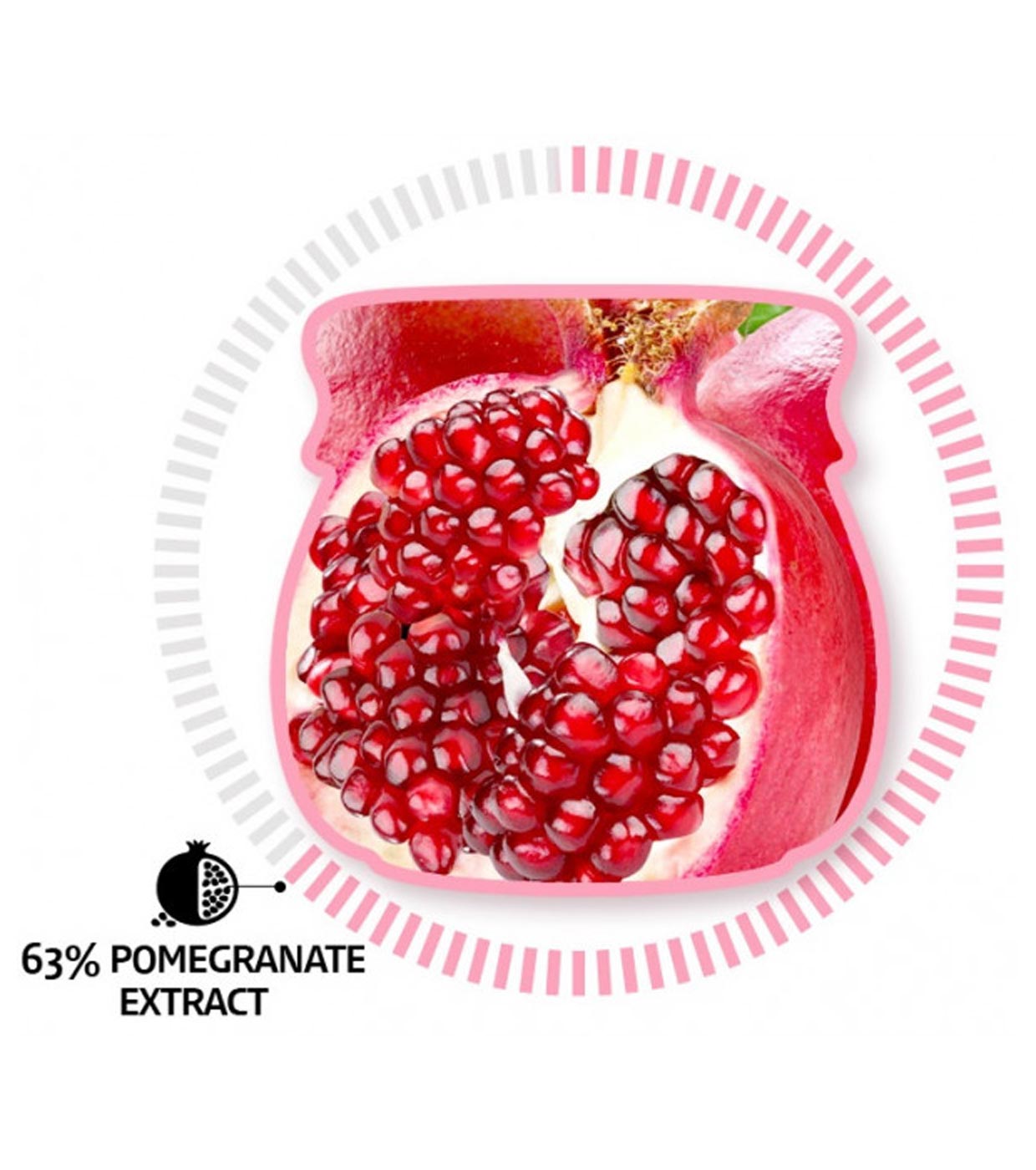 Formulado con un 63% de granada rica en polifenoles en lugar de agua para hidratar intensamente la piel seca y reseca.
