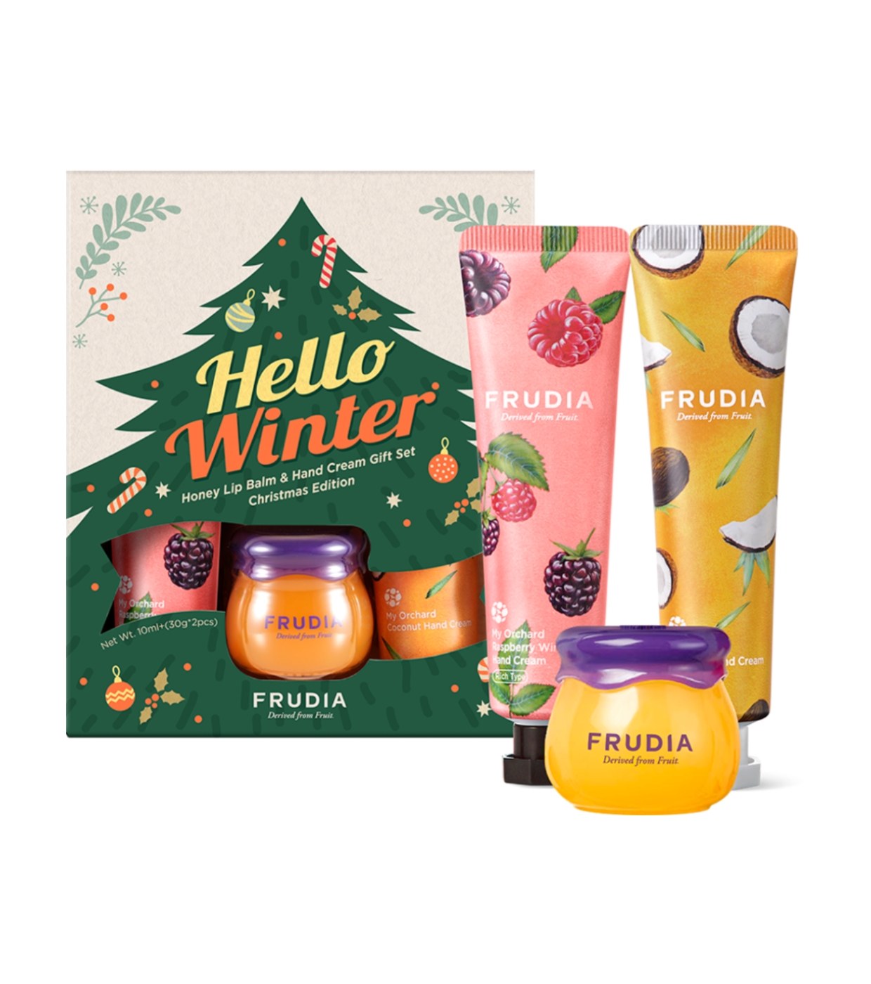 Este set de cremas de manos + Bálsamo de labios Hello Winter de Frudia es ideal para regalar combina el cuidado esencial de manos y labios, ofreciendo hidratación y protección para la piel seca y dañada. Incluye: