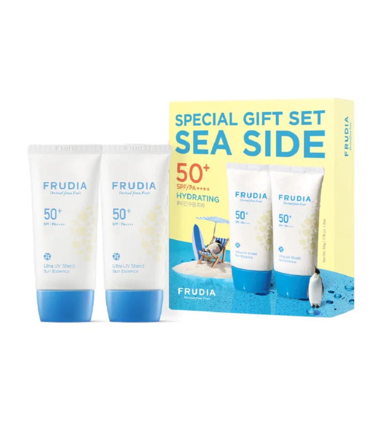 Este set de protectores solares SPF 50+ PA ++++ Sea Side de Frudia combina una protección UV eficaz con una hidratación intensa, ideal para mantener la piel protegida y nutrida bajo el sol.