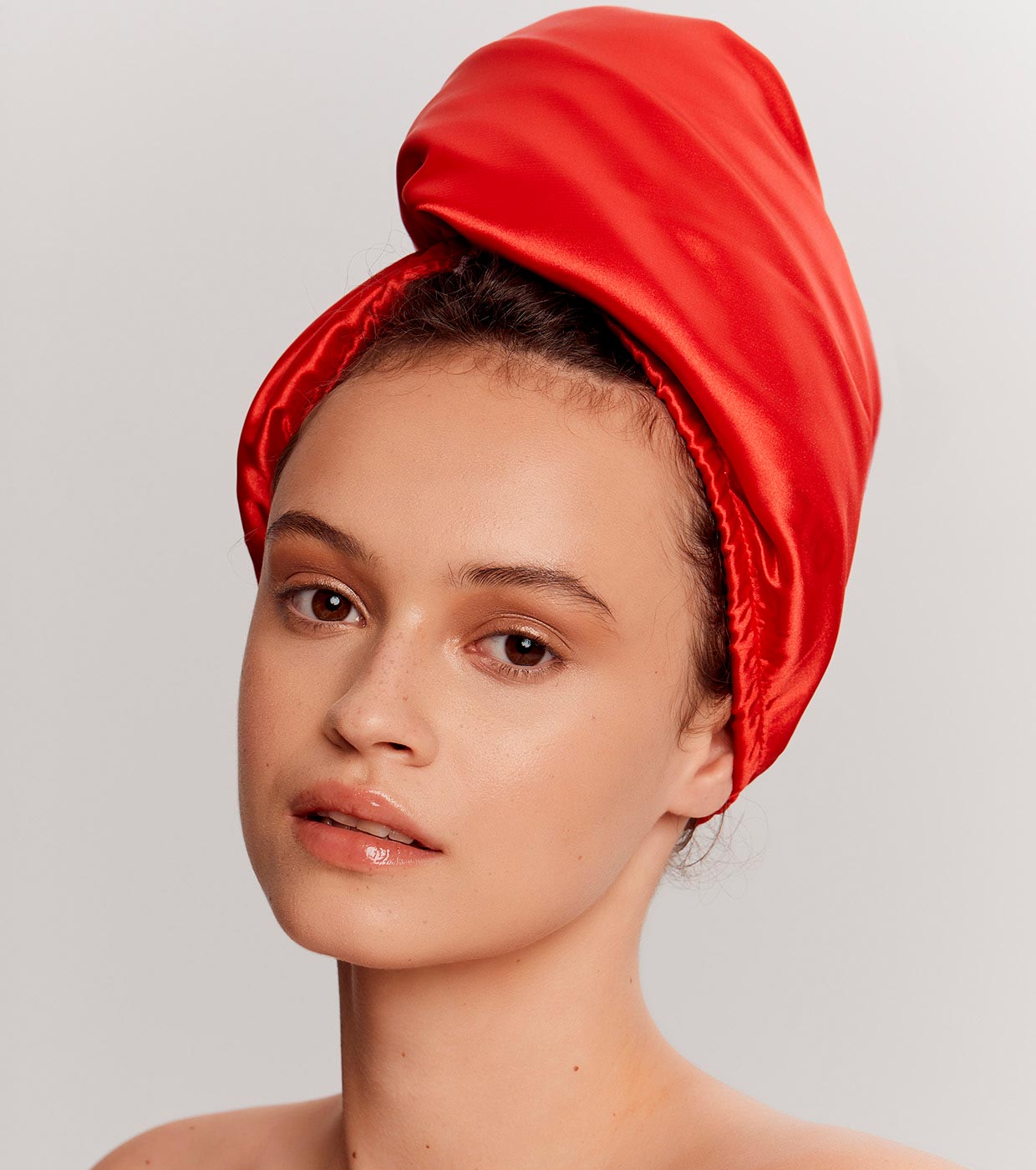 Este turbante es de doble cara: por un lado saten y por el otro tela absorbente.