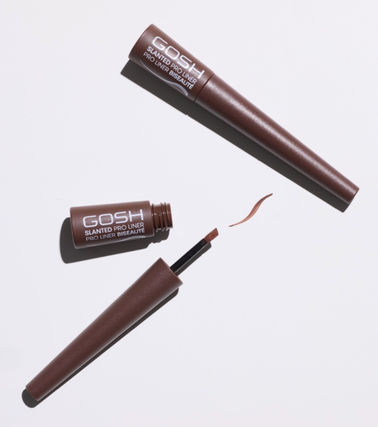 El delineador de ojos líquido Slanted Pro Liner de Gosh es un delineador líquido marrón intenso con aplicador biselado que te permite crear desde líneas finas y elegantes hasta trazos más gruesos y definidos.
