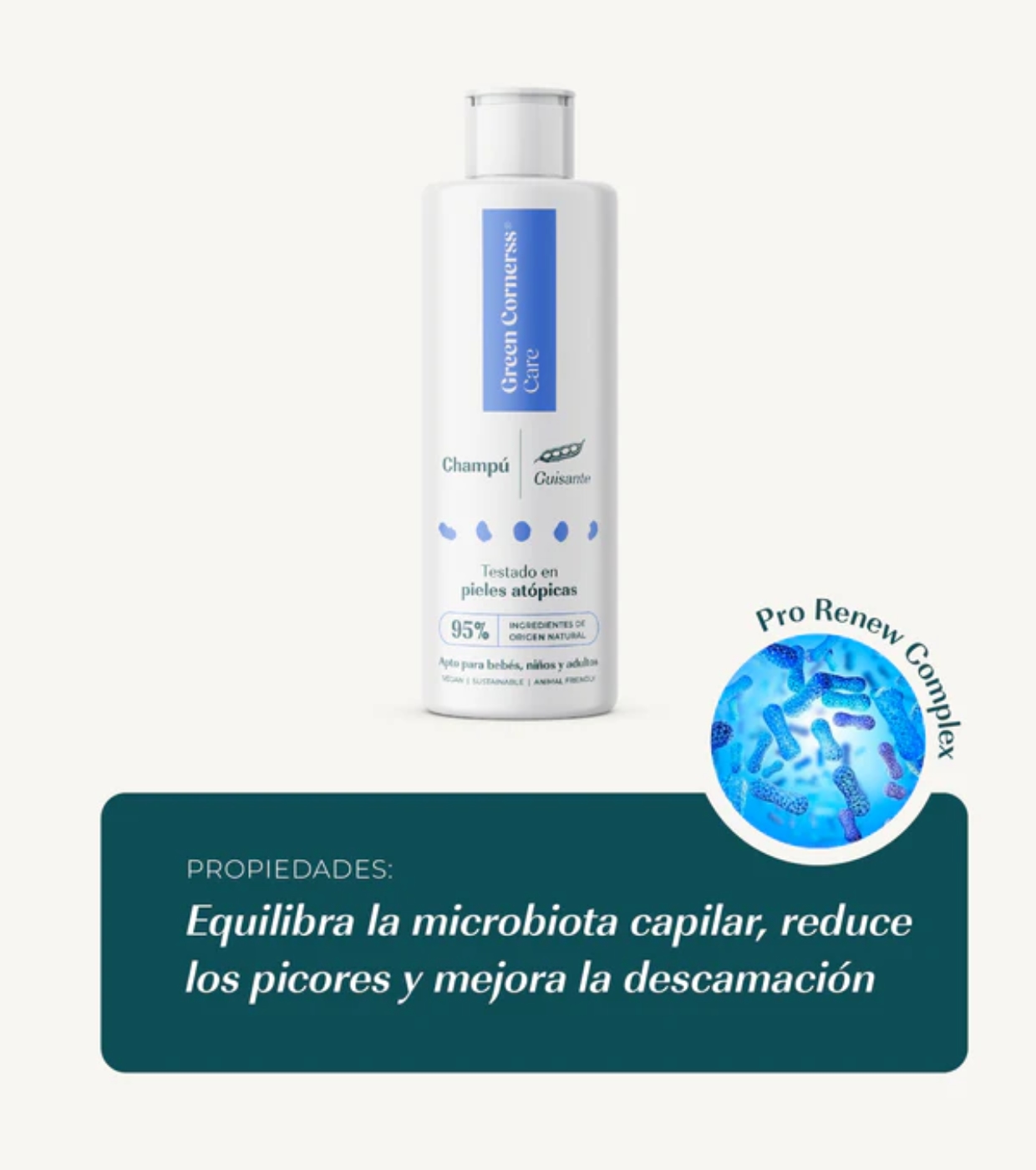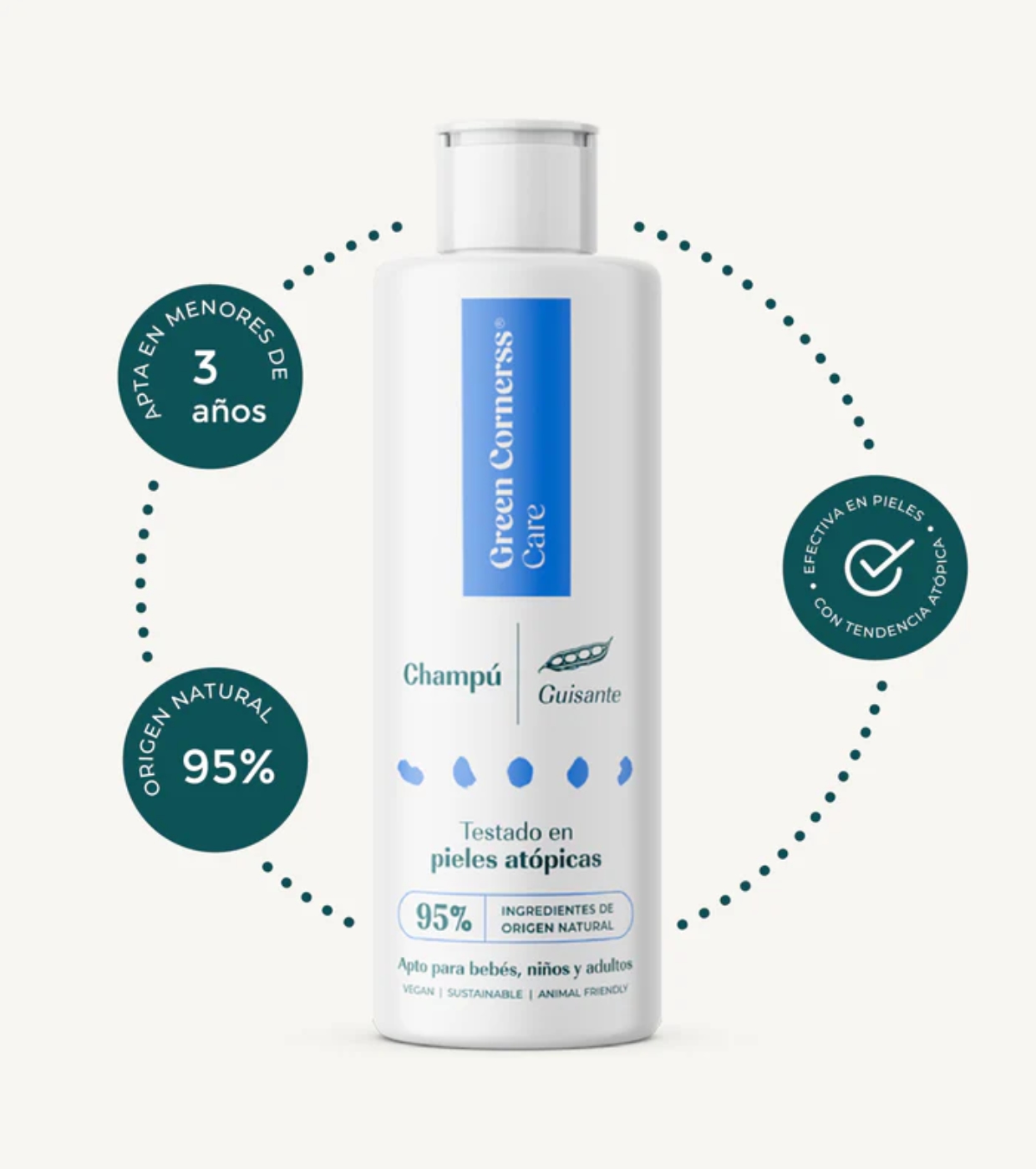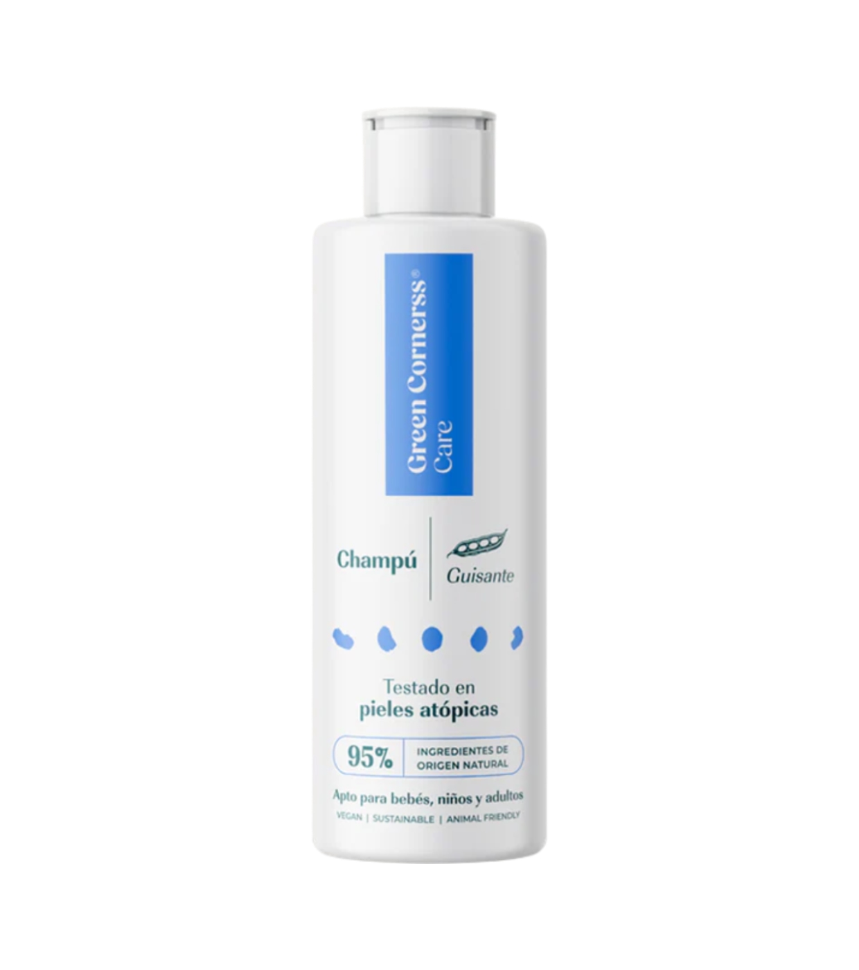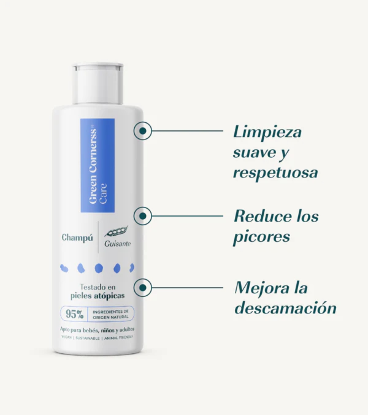 El champú de guisante para cuero cabelludo sensible de Green Cornerss ha sido formulado con una mezcla de agentes limpiadores suaves a base de proteína de guisante, proporcionando una limpieza delicada sin irritar el cuero cabelludo.