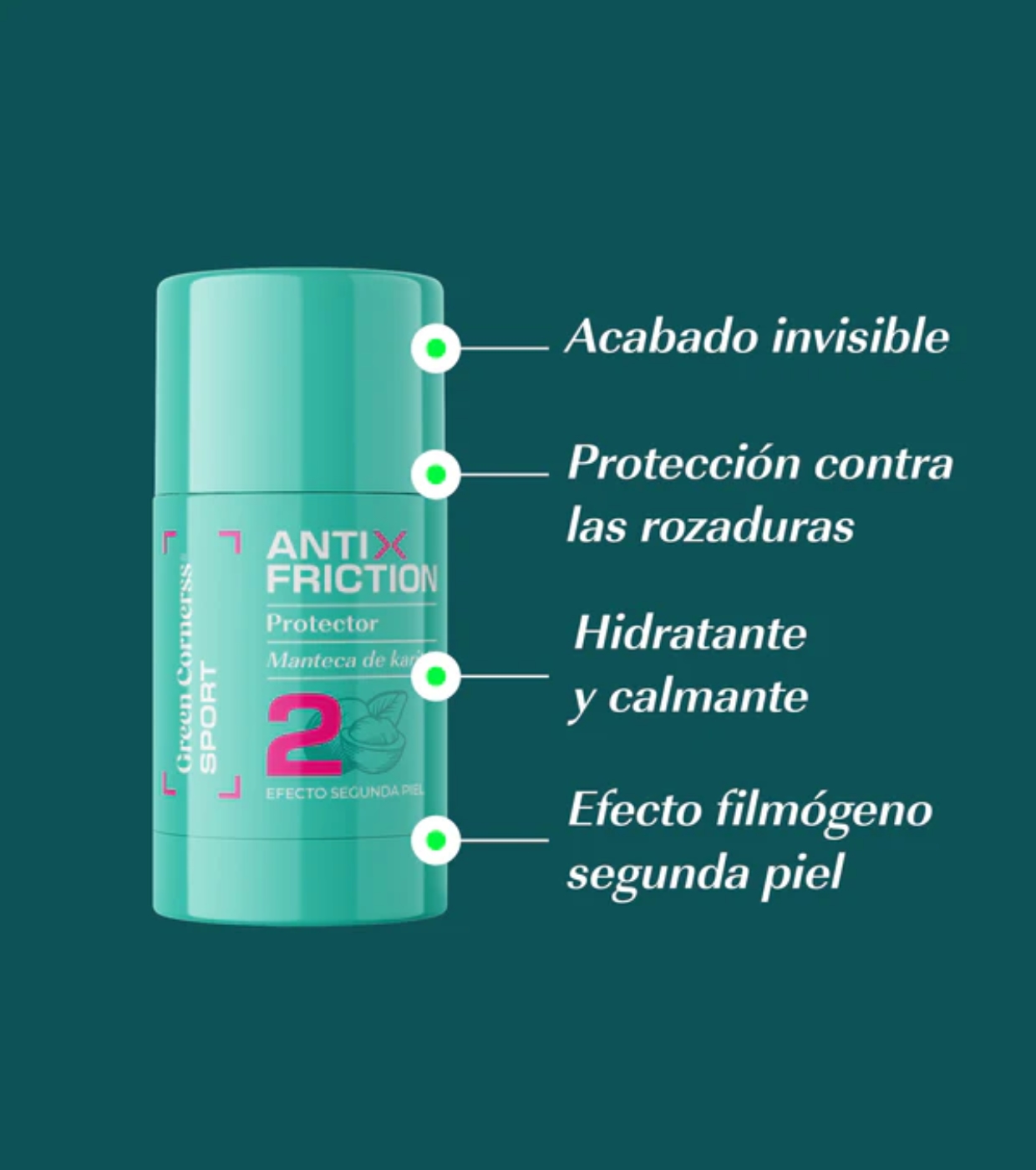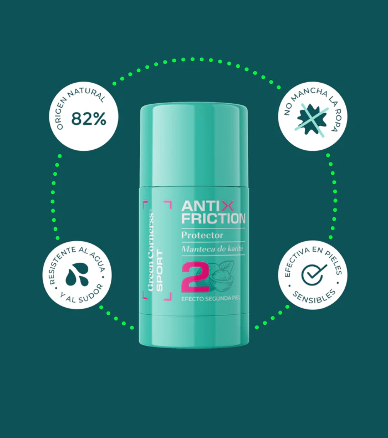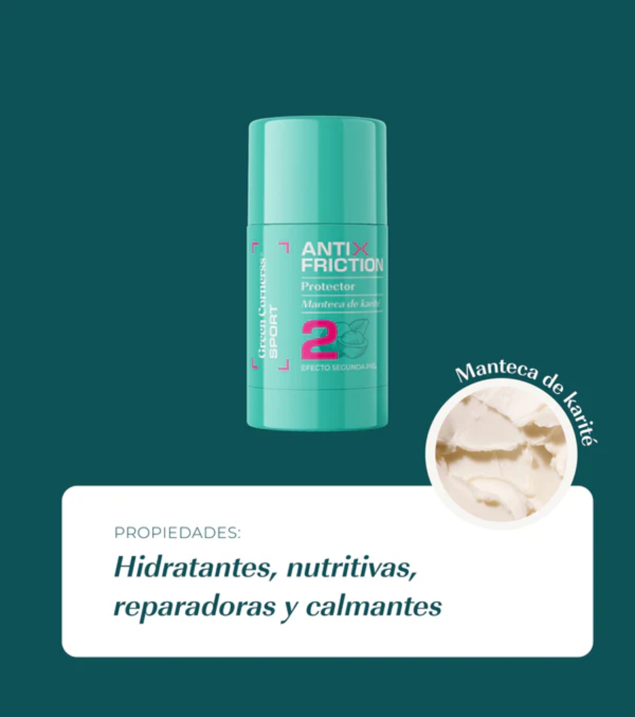 El stick anti-rozaduras con manteca de karité de Green Cornerss ha sido diseñado para prevenir eficazmente irritaciones y fricciones causadas por el roce con ropa, calzado o entre zonas de piel, proporcionando una barrera protectora invisible y transpirable.