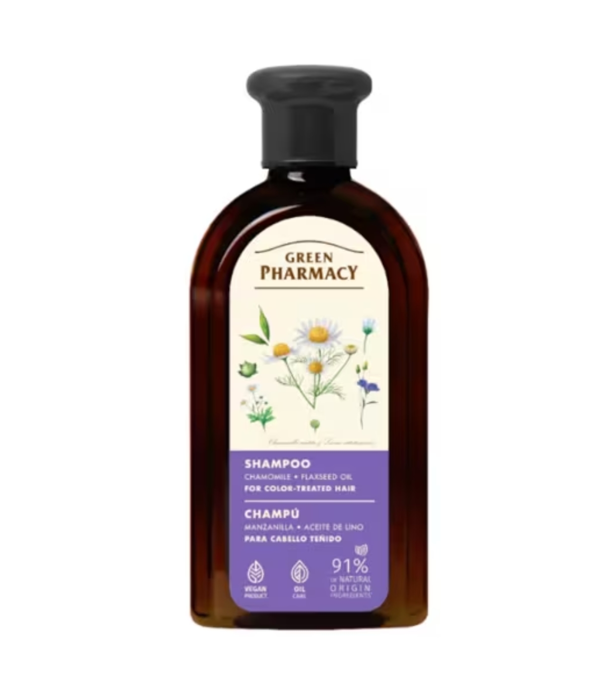 Cuida tu cabello teñido con suavidad y eficacia gracias a este champú enriquecido con extracto de camomila y aceite de lino de Green Pharmacy.