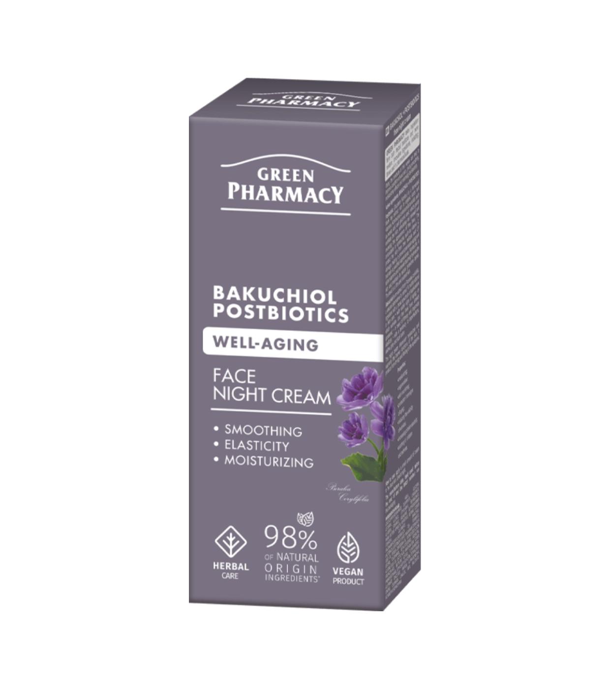 La crema facial antiedad de noche con Backuchiol y Postbióticos de Green Pharmacy ha sido diseñada para proporcionar una hidratación profunda y reforzar la barrera protectora de la piel durante la noche.