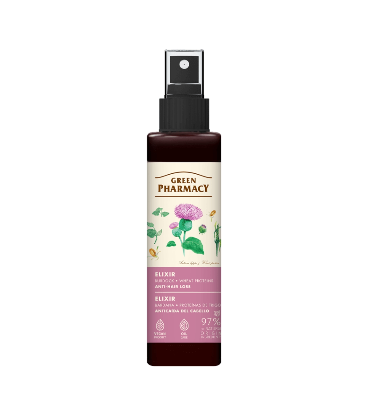 El elixir anticaída con aceite de bardana y proteínas de trigo de Green Pharmacy es un tratamiento intensivo diseñado para fortalecer el cabello y prevenir su caída.