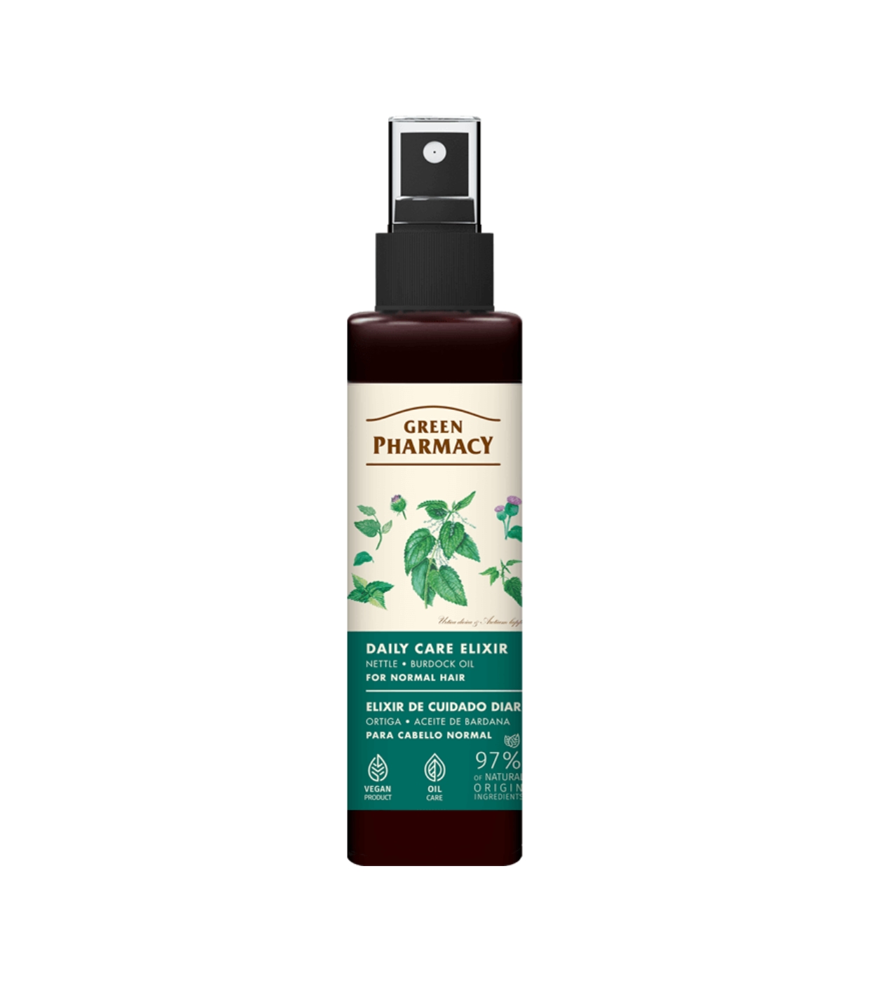 El elixir capilar para cabello normal con aceite de ortiga y bardana de Green Pharmacy proporciona un cuidado integral, mejorando la salud y apariencia del cabello desde la raíz hasta las puntas.