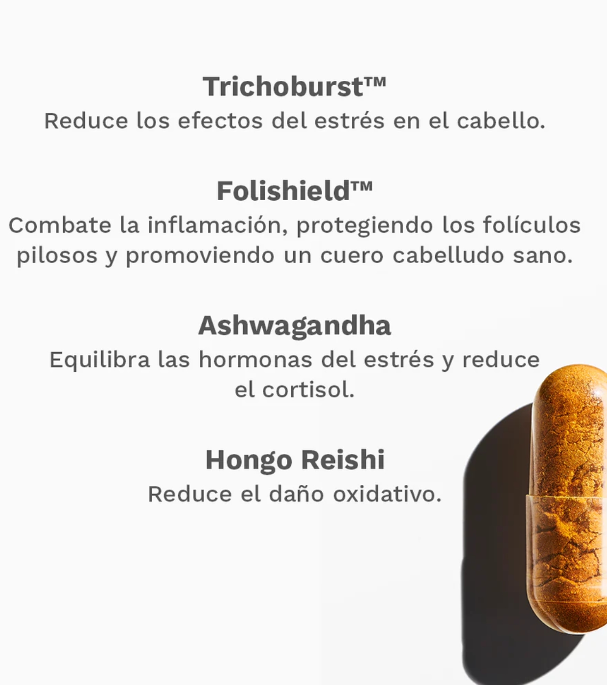 Gracias a sus dos combinaciones patentadas, TrichoBurst™ y Folishield™, este suplemento liderado por la ciencia actúa desde el interior para ofrecer resultados visibles y duraderos.