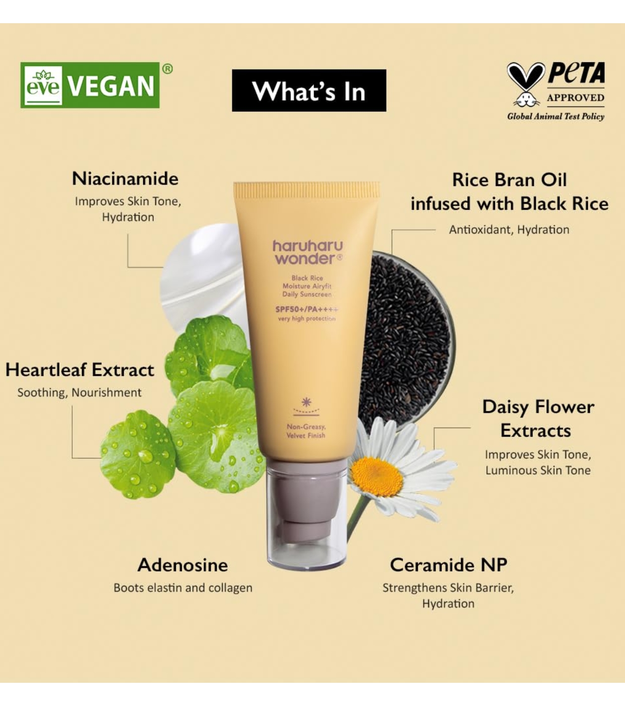 El protector solar Black Rice SPF50+/PA++++ de Haruharu Wonder es un protector solar diario suave y efectivo que brinda una protección completa contra los dañinos rayos UV.