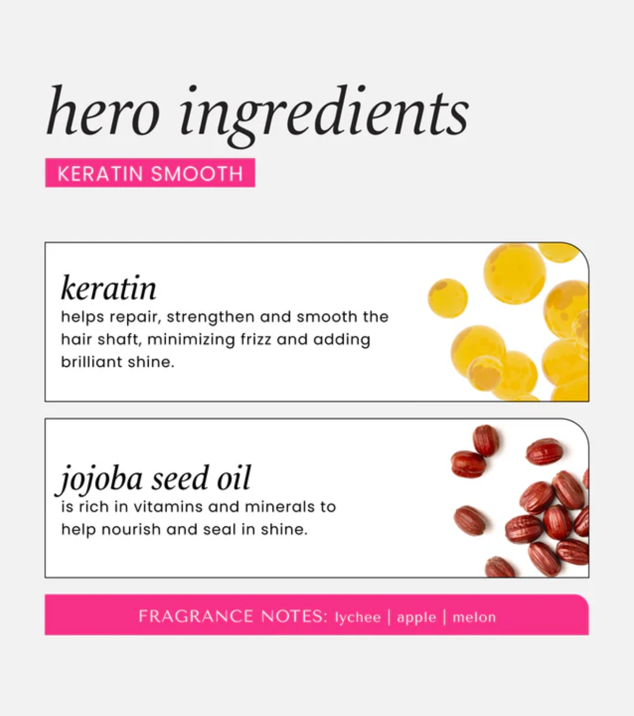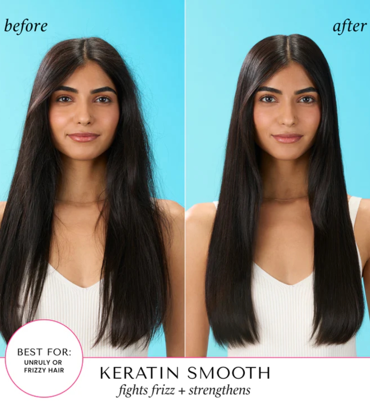 - Formulado con queratina suavizante para mejorar la textura del cabello.