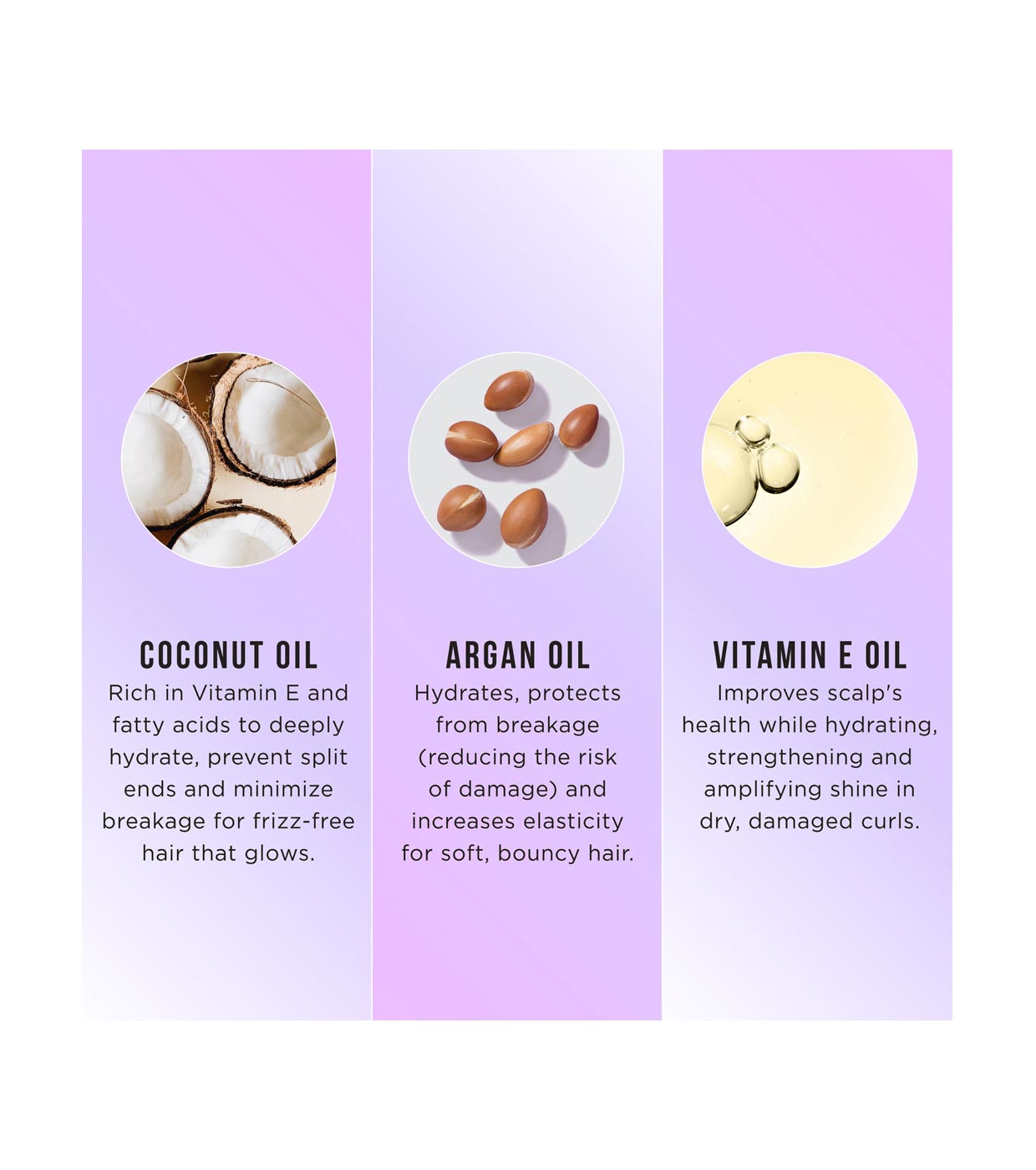 Con aceite de coco, aceite de argán orgánico y vitamina E para nutrir, proteger y definir los rizos.