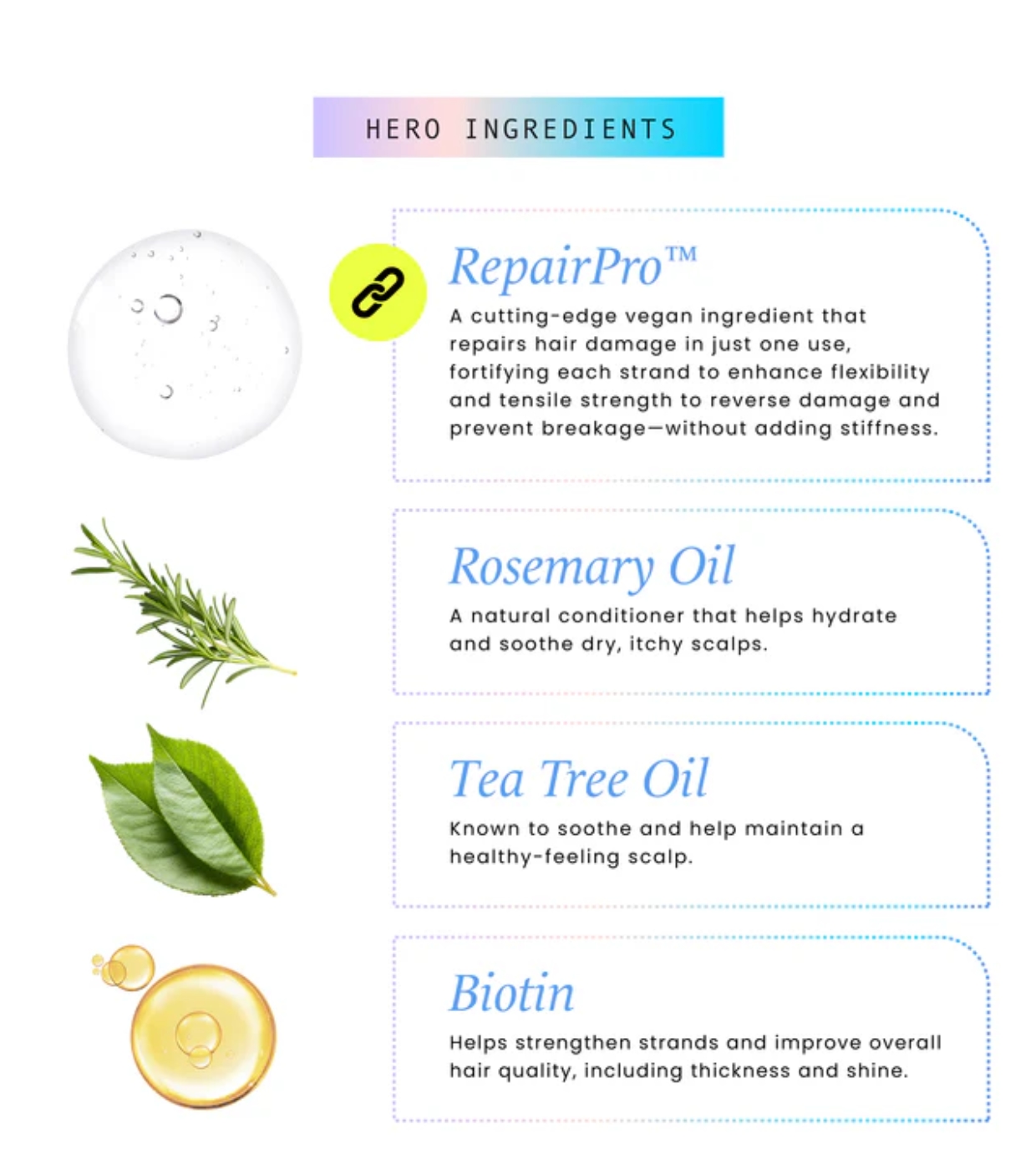 - Contiene biotina, aceite de romero y árbol de té para revitalizar el cuero cabelludo.