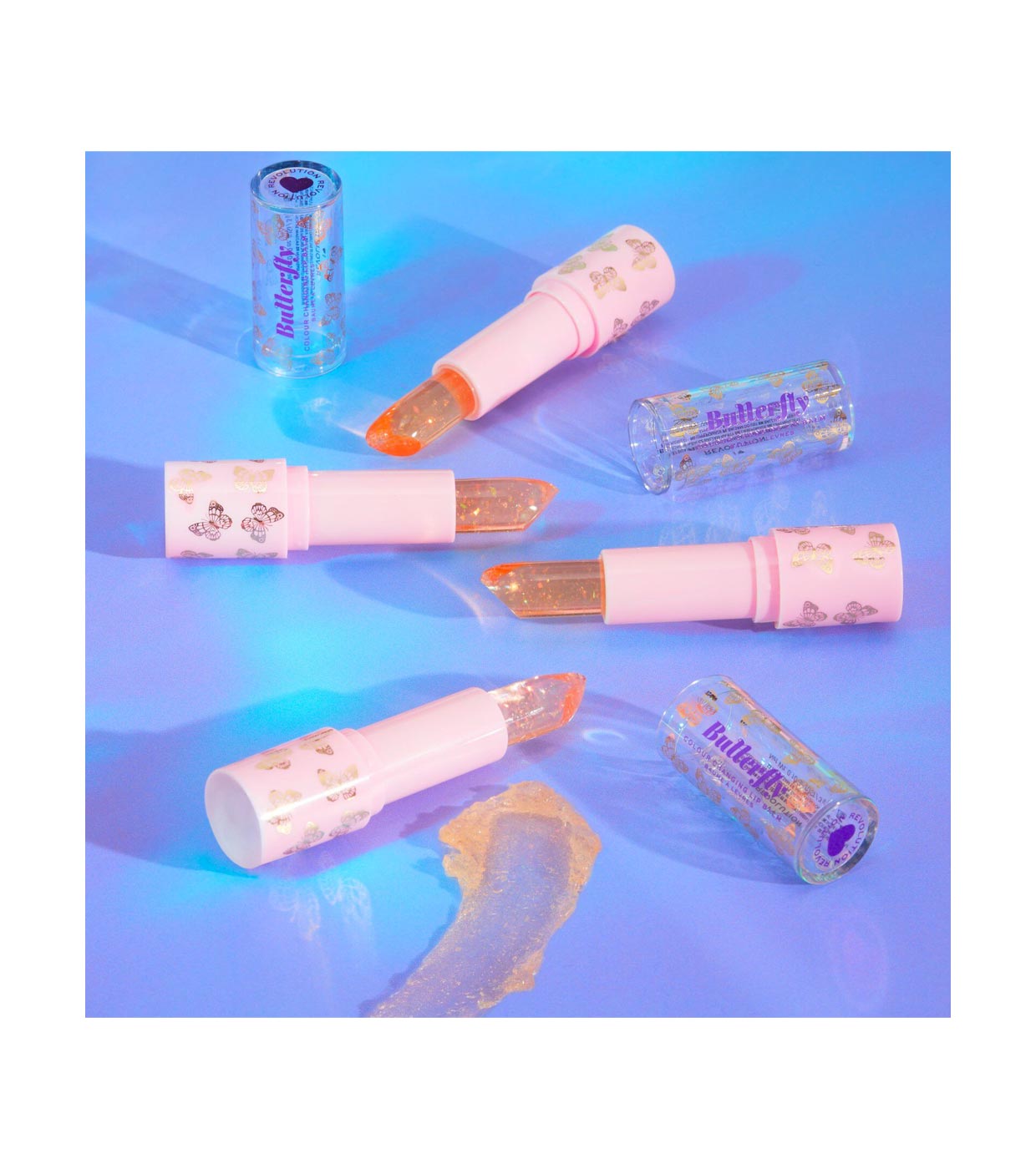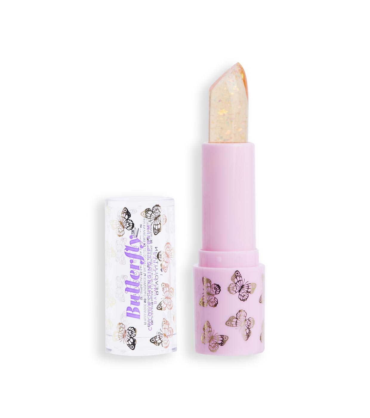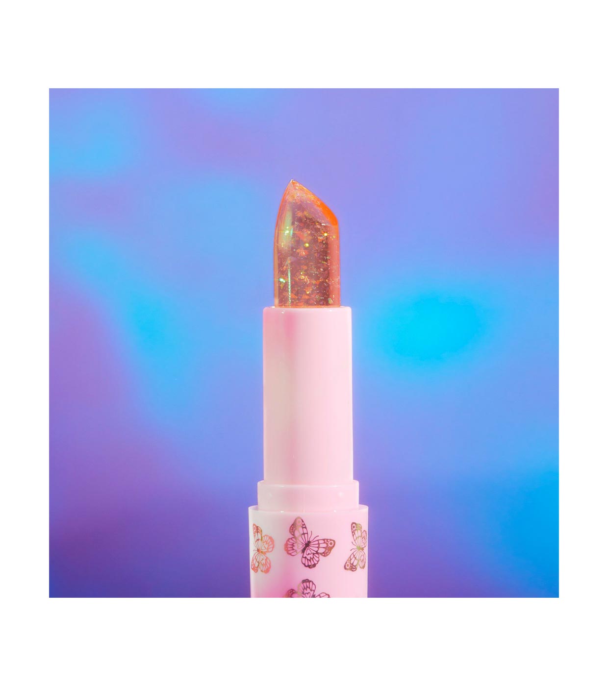 Mantén tus labios a punto de volar con este mágico bálsamo labial con pH reactivo: una nostálgica fórmula transparente con purpurina incrustada que cambia de color a medida que la aplicas.