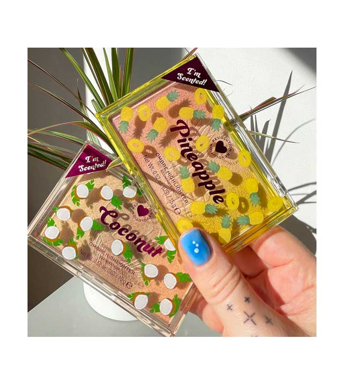 Este iluminador en degradado pasa de tonos champán a dorados bronceados, todo ello con un acabado de aroma tropical a coco.